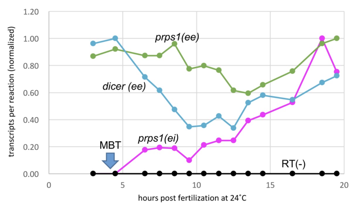 transcripts (ei, precursor RNA) were used. Copy numbers per reaction were calculated and normalized taking the highest amount as 1. RT(-) are control qPCR trials for each primer sets using RNA as templates (represented in black). The timing of midblastula transition (MBT) is indicated.