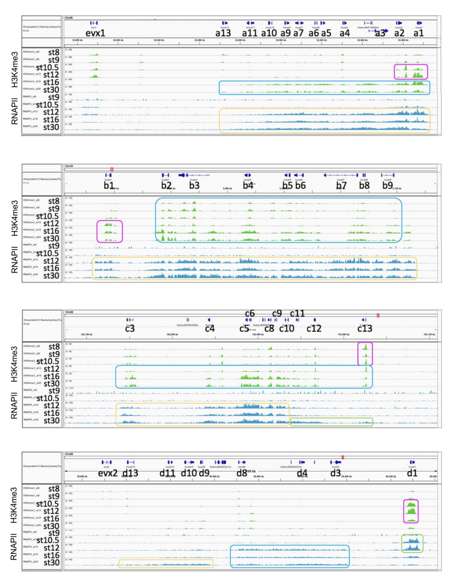 Fig. 4. Epigenetic and Pol II marks on the Hox clusters.