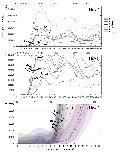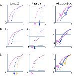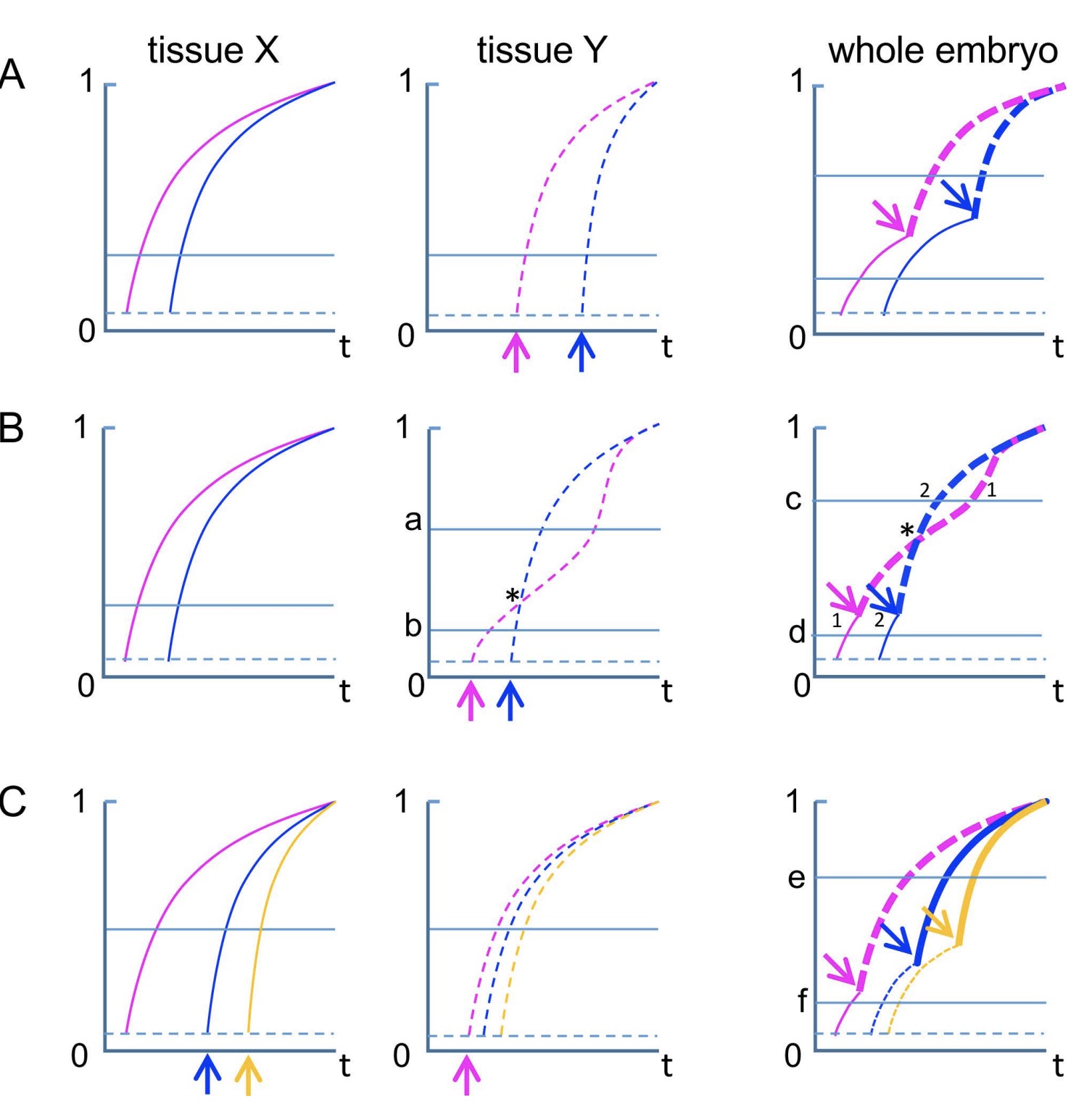 Simulation of the time course of de novo expression of two or three hox genes 1 (magenta), 2 (blue), and 3 (yellow) in two tissues (X and Y, left and middle panels) and in the whole embryo (the sum of tissues X and Y, right panels) are depicted, assuming genes start expression in the order according to the temporal collinearity hypothesis, from gene 1 to 3 (anterior to posterior), and expression starts in tissue X earlier than tissue Y. x-axis, time (t); y-axis, the number of transcripts (normalized by the highest value as 1); vertical arrows in left and middle panels, the late expression in tissue X or Y compared to the other; oblique arrows in the right-most panel, the start point of cumulative expression (thick lines); solid horizontal lines, a detectable number of transcripts; dashed horizontal lines, detection limits; asterisks, the crossing point of transcript number between genes.