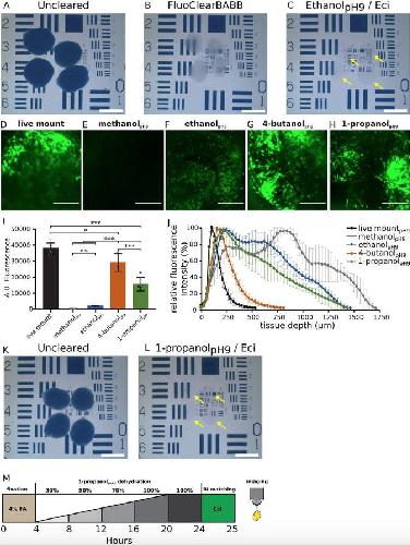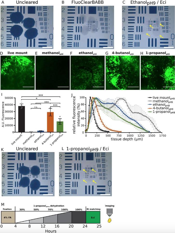 Ethyl cinnamate clearing optimizations in cerebral organoids. Whole-mount recording of >100-day-old cerebral organoids after fixation without clearing (A), using FluoClearBABB (B) and ethanolpH9/Eci (C). Yellow arrows mark organoids, two independent repetitions were performed. (D-H) Dehydration agent-dependent fluorescence after Eci-mediated clearing using confocal z-stack recordings. (I) The mean±s.e.m. of the maximal fluorescence of z-stacks was quantified for organoids live mounted in PBS (D) and compared with methanol (E), ethanol (F), 4-butanol (G) and 1-propanol (H) dehydration (30%, 50%, 70%, 2Ã100% at pH 9.0) and subsequent refractive index match with Eci. (n=6). Data are mean±s.d. *P<0.05, ***P<0.001. (J) Quantification of tissue autofluorescence (GFPâ organoids) using confocal z-stack recordings through alcohol-Eci cleared organoids as a measure of clearing efficiency relative to maximum intensity. Data are mean±s.d. Uncleared organoids (K) are efficiently cleared (L) in as little as 25â h, including fixation, dehydration/delipidation and refractive index matching. (M) Schematic illustration showing the timeline of fixation, dehydration and RI matching required for 2Eci implementation on cerebral organoids. Scale bars: 3â mm in A-C,K,L; 100â µm in D-H. Significance was calculated using one-way ANOVA and a post-hoc Tukey's test.