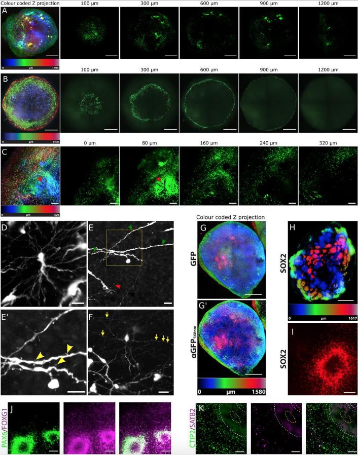 Characterization of 2Eci clearing in human cerebral organoids. (A,B) Colour-coded z-projection and representative z-slices of both 2Eci cleared (A) and uncleared (B) sparsely labelled (3% GFP+) 80-day-old cerebral organoids. 2Eci allows imaging through whole organoids. Spots of colour aggregation depict aggregations of GFP+ neuronal stem cells in neuronal rosettes, whereas maturing neurons distribute more equally throughout the organoid. (C) Detailed morphology can be observed, including neuronal rosettes (red arrowhead) and more mature neurons in a 80-day-old sparsely labelled cerebral organoid. (D-F) 3D reconstruction of multiple neurons in 80-day-old sparsely labelled cerebral organoids. (D,E) Cellular details such as cell body shape and neurites can be observed. (E) Putative dendrites (green arrowheads) and axons (red arrowheads) are maintained after clearing. (Eâ²) Magnified view of the boxed area in E reveals putative dendritic spines (yellow arrowheads). (F) Putative axonal boutons (yellow arrows) can be identified. (G,Gâ²) Colour-coded z projections of both endogenous GFP (G) and GFP antibody staining using primary and secondary antibodies (αGFP568nm) (Gâ²) in a single organoid reveal full penetration of antibodies. (H-K) Antibody labelling for a variety of neuronal markers efficiently labels different populations of cells in cerebral organoids. (H) Colour-coded z projection of a SOX2 antibody-labelled 60-day-old cerebral organoid. SOX2 is a marker for neuronal stem cells, and labels neuronal rosettes in cerebral organoids. (I) Higher magnification of a SOX2+ neuronal rosette in a cerebral organoid. (J,K) Staining for dorsal forebrain progenitors (J) (FOXG1+, PAX6+) as well as early (CTIP2+) and late (SATB2+) born cortical neurons (K). The lumen of the neuronal rosette is marked with a yellow dashed line; the ventricular zone is marked with a white dashed line. Scale bars: 500â µm in A,B; 50â µm in C; 10â µm in D-F; 500â µm in G-H; 50â µm in I-K.