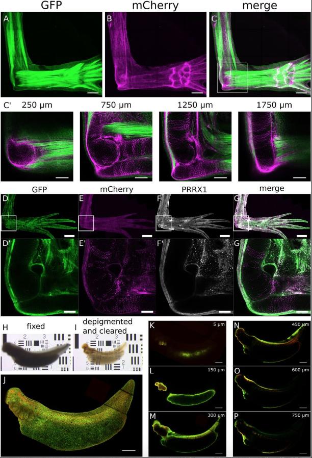 Axolotl adult and embryos tissues are efficiently cleared using 2Eci. (A-C) Axolotl limb of Prrx1:ER-Cre-ER CAGGs:LP-GFP-LP-Cherry double transgenic animals are efficiently cleared, preserving both GFP (A, green) and mCherry (B, magenta) after 2Eci clearing of double transgenic axolotl. (C,Câ²) The box in C marks the elbow. Detailed morphology can be observed throughout the limb, including loose connective tissue, skeletal elements and tendons. (D-G) Col1a2:ER-Cre-ER; CAGGs:LP-GFP-LP-Cherry stained with a Prrx1 antibody. Col1a2 cells are indelibly changed from GFP (D) to mCherry (E) signal. Combining this with antibody staining for Prrx1 (F) allows for the creation of a three-channel image, highlighting the complex heterogeneous nature of connective tissue (G). (D-G) Maximum intensity projections of the entire limb. The box marks the elbow. Single slice z positions of the elbow are shown in Dâ²-Gâ². (H,I) When combined with depigmentation, 2Eci results in efficiently cleared axolotl embryos. (J) Maximum intensity projection of a double transgenic CAGGs:GFP; CAGGs:mCherryNuc axolotl embryo after antibody labelling for GFP and Cherry. (K-P) Single-plane recordings at various z-depths throughout the embryo depicted in J show recordings up to 750â µm deep can be acquired. Scale bars: 500â µm in A-C,D-G,J-P; 200â µm in Câ²; 250â µm in Dâ²-Gâ²; 1â mm in H,I.