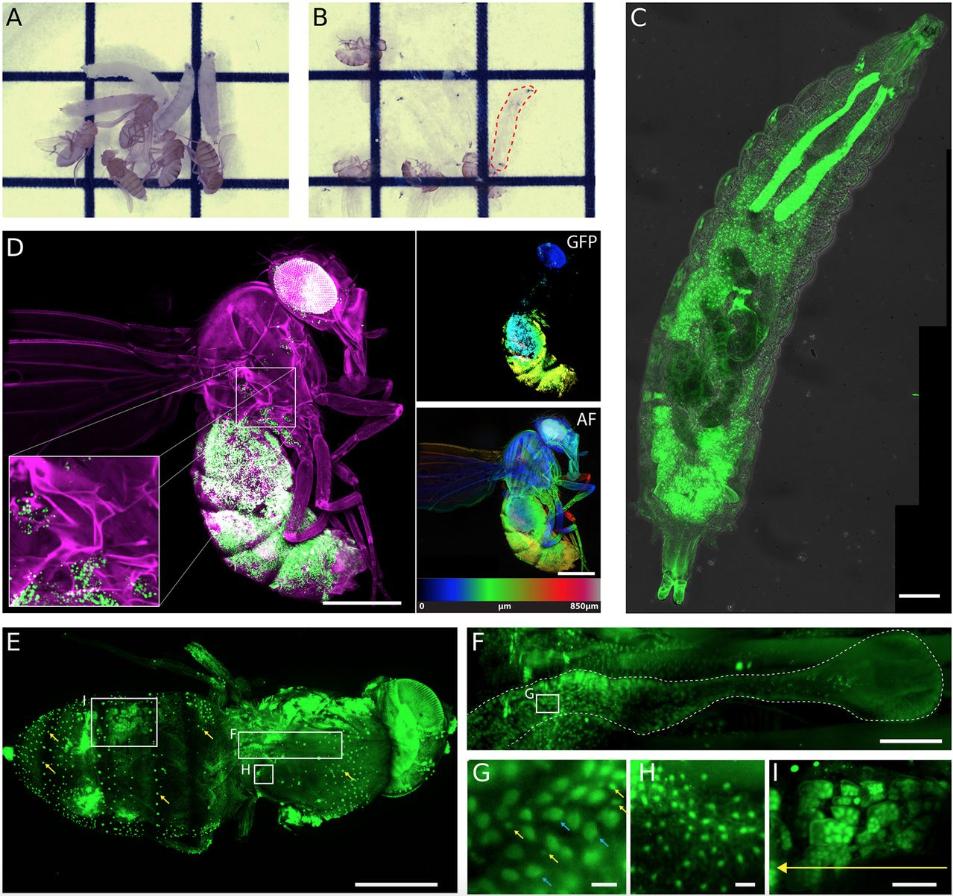 Drosophila adults and larvae are efficiently cleared using 2Eci. (A,B) Drosophila larvae and adult Drosophila before (A) and after (B) 2Eci clearing. Red dashed outline indicates one of eight cleared Drosophila larvae in the image (B). (C) Maximum intensity projection of a Krp-GFP Drosophila larvae. Krp-GFP+ salivary glands and fat body tissue can be observed throughout the larvae. (D) Whole Krp-GFP Drosophila virgin z-projection. Green represents GFP fluorescence subtracted by 561 autofluorescence; magenta represents 561â nm autofluorescence. (Right) Colour-coded z projections of both GFP-561AF and 568â nm autofluorescence (AF). (E) Immunostaining for GFP using primary and secondary antibodies (Alexa 568) in SBR-GFP adult Drosophila allows for observation of morphological details after 2Eci clearing. Bright dots (yellow arrows) are bristle follicles. Boxes show where the images in F, H and I are taken from. (F) Z projection of the cardia and anteriormidgut (white dashed outline), as well as different populations of the midgutepithelium (box G). (G) In the midgut, diploid (intestinal stem cells, enteroblasts and enteroendocrine cells, yellow arrows) and polyploid (enterocytes, blue arrows) cells can be distinguished based on nuclei size. (H) Polyploid fat body cells. (I) Ovaries can be identified, labelling the entire process of egg chamber maturation, from germinal stem cells to meiosis and egg formation (in the direction of the yellow arrow). Scale bars: 500â µm in C-E; 100â µm in F,I; 10â µm in G; 20â µm in H. Grid size: 5Ã5 mm squares in A,B.