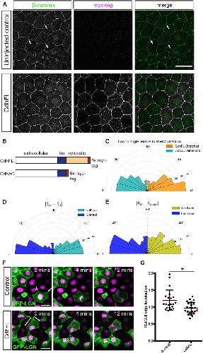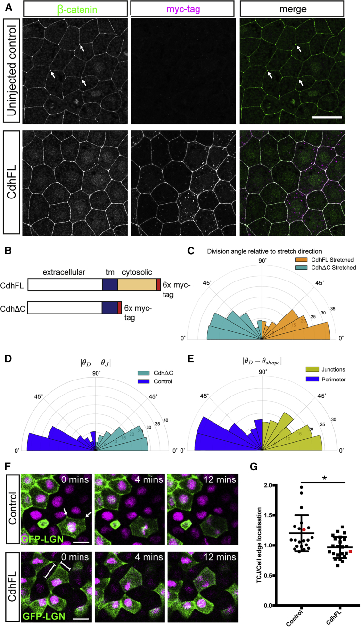 Figure 4. C-Cadherin Is Required to Orient the Mitotic Spindle According to Cell Shape(A) Single confocal slices from immunofluorescent staining for β-catenin (green) and myc-tag (magenta) in uninjected and CdhFL-injected stage 12 embryos (stage matched to time that animal caps are stretched and imaged). Hotspots of β-catenin localization (arrows) are seen at TCJs in controls but are lost when CdhFL is overexpressed.(B) Schematic of Cadherin constructs CdhFL and CdhÎC.(C) Rose plot of division angles, θD, relative to direction of stretch for cells from stretched CdhÎC-injected (411 cells; cyan) and stretched CdhFL-injected experiments (552 cells; orange). CdhFL-injected cells align significantly better with direction of stretch (p < 0.0162, Mann-Whitney U test).(D) Rose plot of difference between division angle, θD, and orientation of shape on the basis of junctions, θJ, for cells from CdhÎC-injected experiments (390 cells; cyan) and control experiments (239 cells; blue). Distributions are significantly different (p < 0.016 Kolmogorov-Smirnov test).(E) Rose plot of difference between division angle, θD, and orientation of shape on the basis of perimeter, θP, (blue) and junctions, θJ, (yellow) for 96 cells from CdhFL-injected experiments that satisfied |θPâθJ|â¥15°. θD aligns significantly better to θP than a random distribution (p < 0.004; Kolmogorov-Smirnov test), but not to θJ.(F) Images from time-lapse videos of control and CdhFL-injected animal cap tissue expressing GFP-LGN in a mosaic fashion. In control cells, GFP-LGN is enriched at TCJs during interphase (arrows), and this localization persists through mitosis. The enrichment of GFP-LGN at TCJs is lost when CdhFL is expressed, with localization spread throughout the cell edge (line).(G) Quantification of GFP-LGN localization at TCJs compared with cell edges in single mitotic cells in animal caps. GFP-LGN is more strongly localized at TCJs compared with cells edges in controls, but this bias is lost in CdhFL-injected tissue (âp < 0.05, Kolmogorov-Smirnov test; n = 21 and 23 mitotic cells from seven and six unrelated animal caps for control and CdhFL, respectively). Error bars represent mean and SD.Red points show quantification for mitotic cells highlighted in (F). Rose plots show percentage of cells. Scale bars, 20 μm.See also Figure S3. |