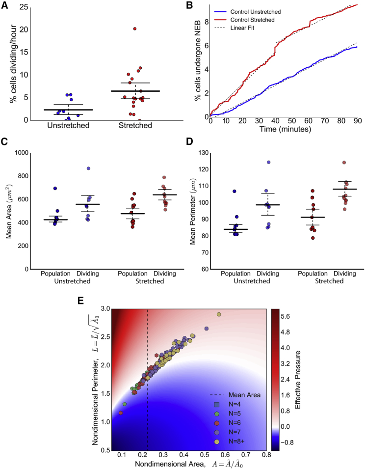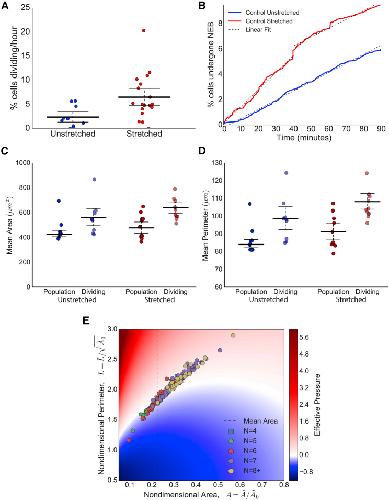 Figure 5. Stretching Increases Division RateDividing cells have large area, perimeter, and relative effective pressure.(A) Division rate (percentage of cells entering mitosis per hour) increases in stretched tissue compared with unstretched. Ninety-five percent confidence intervals do not overlap, indicating significant difference. Each point represents the mean division rate from an animal cap.(B) Percentage of cells that have undergone nuclear envelope breakdown (NEB) with respect to time in control stretched (red) and unstretched (blue) experiments from (A). Dashed lines indicate linear lines of best fit; control unstretched experiments have gradient 4.2% cells undergoing division per hour. Stretched experiments have initial gradient 8.1% and then 4.35% cells undergoing division per hour.(C) Comparison of mean area of population of all cells versus dividing cells from unstretched and stretched control experiments. Error bars represent mean and 95% confidence intervals, which do not overlap between the population and dividing cells, indicating a significant difference.(D) Comparison of mean perimeter of population of all cells versus dividing cells from unstretched and stretched control experiments. Error bars represent mean and 95% confidence intervals, which do not overlap between the population and dividing cells, indicating a significant difference.(E) Heatmap showing predicted relative isotropic stress (effective pressure, Peff) of dividing cells from control unstretched experiments. Areas and perimeters have been nondimensionalized using the preferred areas, A˜0, fitted to each experiment in Figure S4C. Polygonal class (number of neighbors) indicated by marker color and style, with (4, 5, 6, 7, 8+) sided cells given in (blue, green, red, purple, yellow). Dashed vertical line represents mean area of all cells. Cells lying in red (blue) regions are under predicted net tension (compression). |