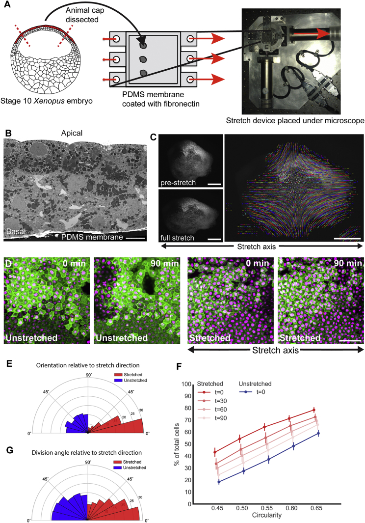 Figure 1. Application of Tensile Force to a Multi-layered Tissue(A) Animal cap tissue was dissected from stage 10 Xenopus laevis embryos and adhered to fibronectin-coated PDMS membranes, and a 35% uniaxial stretch of the membrane was applied.(B) 3View scanning electron micrograph showing that the cultured animal cap tissue is two to three cells thick. Cell shape and divisions were assessed in the apical cell layer.(C) Displacement of nuclei was tracked in a stretched animal cap.(D) Confocal images of the apical cells in unstretched and stretched animal caps (green, GFP-alpha-tubulin; magenta, cherry-histone2B), taken 0 and 90 min after stretch. Representative cells outlined by dashed lines.(E) Rose plot showing orientation of cell shape relative to direction of stretch in unstretched (blue) and stretched (red; measured immediately following stretch) experiments.(F) Cumulative plots of cell circularity in unstretched (blue) and stretched (red; at 0, 30, 60 and 90 min after stretch) animal caps (0 = straight line, 1 = circle). One hundred percent of cells have circularity ≤ 1. Markers are slightly offset for clarity. Error bars represent 95% confidence intervals.(G) Rose plot of division angle relative to direction of stretch for unstretched (blue) and stretched (red) experiments. Kolmogorov-Smirnov test indicates that the unstretched distribution is not significantly different from a uniform distribution, n = 343 divisions, 15 animal caps; Kolmogorov-Smirnov test indicates that stretched distribution is significantly different from uniform, p < 1.4 × 10−9, n = 552 divisions, 17 animal caps.Scale bars, 10 μm in (B), 500 μm in (C), and 50 μm in (D). |
