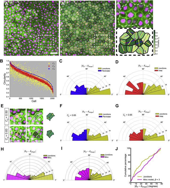 Figure 2. Cell Division Orientation Is Best Predicted by an Axis of Shape Defined by TCJs(A) Representative image of control cells from an unstretched experiment. Scale bar, 20 μm.(A′) Overlay of segmentation of cells given in (A), with the principal axis of shape characterized by area, perimeter, and junctions drawn in red, blue, and yellow, respectively.(A″) Enlargement of segmented cells from white box drawn in (A′); cells analyzed are outlined by dashed white line.(B) Circularities of 2,035 cells from unstretched experiments, with shape characterized by area, perimeter, and junctions plotted in red, blue, and yellow respectively. Cells have been ordered in descending order of perimeter-based circularity (CP), with the corresponding values of CA and CJ plotted alongside.(C) Rose plot of difference between division angle, θD, and orientation of shape on the basis of perimeter (blue; θshape=θP) and junctions (yellow; θshape=θJ), for cells that satisfy |θP−θJ|≥15°.(D) Rose plot of difference between division angle, θD, and orientation of shape on the basis of area (red; θshape=θA) and junctions (yellow; θshape=θJ), for cells that satisfy |θA−θJ|≥15°.(E) Examples of elongated (top) and round (bottom) cells where division angle (black arrows) is well predicted by the principal axis of shape defined by area (yellow arrows).(F) Rose plot of difference between division angle, θD, and orientation of shape on the basis of perimeter (blue; θshape=θP) and junctions (yellow; θshape=θJ), for round cells that satisfy CA > 0.65.(G) Rose plot of difference between division angle, θD, and orientation of shape on the basis of area (red; θshape=θA) and junctions (yellow; θshape=θJ), for round cells that satisfy CA > 0.65. See also Figure S1.(H) Rose plot of difference between division angle, θD, and orientation of shape on the basis of Minc model when β = 3 (magenta; θshape=θMinc) and junctions (yellow; θshape=θJ) for all cells in stretched and unstretched experiments (n = 599 cells).(I) Rose plot of difference between division angle, θD, and orientation of shape on the basis of Minc model when β = 3 (magenta; θshape=θMinc) and junctions (yellow; θshape=θJ), for cells that satisfy |θMinc−θJ|≥15° (n = 65 cells).(J) Cumulative plot of difference between division angle, θD, and orientation of shape for data shown in (I). |
