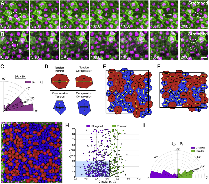 Figure 3. Division Orientation Is Better Predicted by Shape Rather Than High Relative Isotropic or Shear Stress(A) Images taken from a confocal time-lapse video of a division in a cell in stretched tissue whose interphase shape (dashed line, 0:00) is oriented with the stretch (horizontal) axis. Cell division aligns with both cell shape and stretch axis.(B) Time-lapse images of an unusual cell in a stretched tissue, whose interphase shape (dashed line, 0:00) is oriented against the stretch axis. Cell division aligns with cell shape but against the stretch axis.(C) Rose plot of difference between division angle, θD, and orientation of shape on the basis of junctions, θJ, for cells from stretched experiments, where θJ was at least 60° divergent to the direction of stretch. Twenty-nine cells satisfied this condition. Kolmogorov-Smirnov test found a significant difference from a uniform distribution (p = 0.022).(D) Representative cells showing classification of cell stress configurations. Red (blue) cells are under net tension (compression), where Peff is positive (negative). Larger (smaller) black arrows indicate the orientation of the principal (secondary) axis of stress, with inward- (outward)-pointing arrows indicating the tension (compression) generated by the cell. Yellow arrows indicate the principal axis of shape defined by cell junctions, which aligns exactly with a principal axis of stress.(E) Fifty simulated cells randomly generated in a periodic box, relaxed to equilibrium with parameters (Λ,Γ) = (−0.259, 0.172), under conditions of zero global stress (Nestor-Bergmann et al., 2018a). Red (blue) cells are under net tension (compression). Principal axis of stress (shape) indicated in black (yellow).(F) Cells from (E) following a 13% area-preserving uniaxial stretch along the x axis.(G) Example segmented cells from an unstretched experiment. Cells in red (blue) are predicted to be under net tension (compression).(H) Cell circularity defined by junctions, CJ, versus |θD−θJ|. Spearman rank correlation coefficient found a significant correlation (p < 3.04 × 10−10). Elongated cells (CJ ≤ 0.65) cluster in blue box, whereas rounded cells (CJ > 0.65) have a more uniform distribution.(I) Rose plot of difference between division angle, θD, and orientation of shape on the basis of junctions, θJ for round (CJ > 0.65; right) and elongated (CJ ≤ 0.65; left) cells shown in (H). Mann-Whitney U test indicated that elongated cells have θJ aligned significantly more with θD than rounded cells (p < 1.64 × 10−8).Scale bars in (A) and (B), 20 μm. All rose plots show percentage of cells.See also Figure S2. |