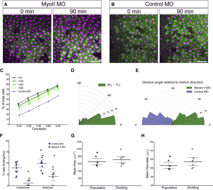 Figure 6. Myosin II MO Cells Maintain Alignment of Division to TCJ Shape, but Have Perturbed Proliferation Rate(A) Images taken from a confocal time-lapse video of stretched myosin II morpholino-injected animal cap explants at 0 and 90 min intervals. Butterfly nuclei seen prominently at 90 min, where nuclei are in contact.(B) Time-lapse images of control morpholino-injected stretched animal cap explants at 0 and 90 min intervals.(C) Cumulative distribution of cell circularity defined by area, CA, in myosin II MO knockdown stretched animal caps (shaded green) at t = 0, 30, 60, and 90 min after stretch. Cumulative distribution for unstretched t = 0 control MO knockdown experiments shown in blue. Error bars represent 95% confidence intervals. Error bars for myosin II MO t = 90 min distribution does not overlap with control MO, indicating a significant difference from unstretched shape. Markers are slightly offset for clarity.(D) Rose plot of difference between division angle, θD, and orientation of shape on the basis of junctions, θJ, for 216 cells from myosin II knockdown stretched experiments. Mann-Whitney U test found significant alignment compared with random (p < 5.72 × 10−15) but no significant difference from equivalent dataset in control stretched experiments. Percentages of cells shown.(E) Rose plot of division angle relative to direction for stretch for control MO (532 cells; blue) and myosin II MO (301 cells; green) experiments. Mann-Whitney U and Kolmogorov-Smirnov tests found no significant difference between the two.(F) Division rate (percentage of total cells entering mitosis per hour) in unstretched and stretched tissue from myosin II MO (green; n = 10 for unstretched and n = 12 for stretched) and control MO (blue; n = 13 for unstretched and n = 10 for stretched) experiments. Error bars represent mean and 95% confidence intervals.(G) Comparison of mean area of population of all cells versus dividing cells from stretched myosin II knockdown experiments. Error bars represent mean and 95% confidence intervals, which overlap, indicating no significant difference.(H) Comparison of mean perimeter of population of all cells versus dividing cells from stretched myosin II knockdown experiments. Error bars represent mean and 95% confidence intervals, which overlap, indicating no significant difference.Scale bars in (A) and (B), 100 μm. |