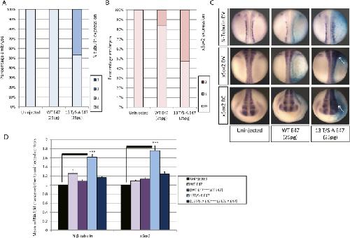 Fig. 3. E47 phospho-status influences endogenous neurogenesis in the neural plate.Embryos were injected with mRNA as indicated and assayed by ISH at stage 18 for N-tubulin (A) [N = 15–18] or xSox2 (B) [N = 19–20] with representative images shown in (C), injected side to the right; DV, dorso-ventral; RC, rostro-caudal. (D) qPCR data from stage 18 embryos injected with molar equivalents of mRNA encoding E protein monomers or tethered homo-dimers [N = 3].