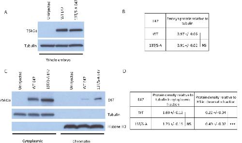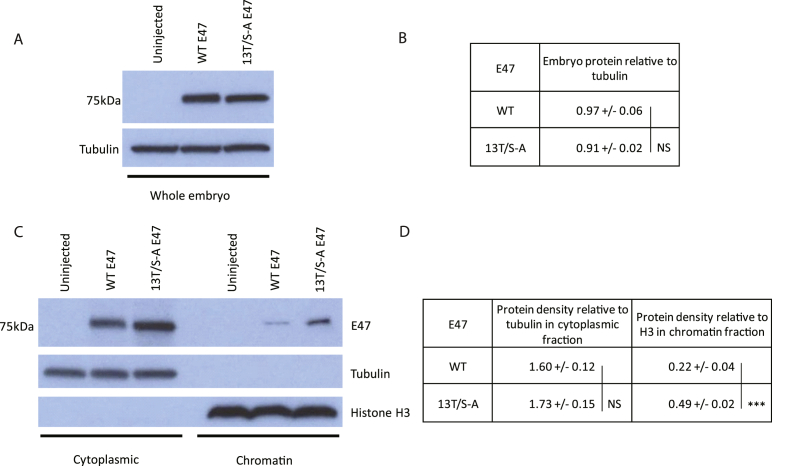 Fig. 4. Phospho-mutant E47 has enhanced chromatin association relative to WT E47.Embryos over-expressing WT and 13T/S-A E47 were analysed by western blot of whole embryo extracts at stage 11 (A) or cytoplasmic and chromatin fractions at stage 13 (C) with E47 protein density calculated relative to loading controls in (B) and (D) respectively. Significance determined using a paired two-tailed Student's t-test; NS = not significant; *** = p < 0.0125.