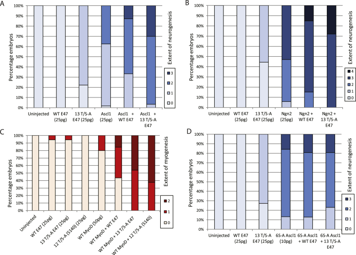 Fig. 2. Manipulation of E47 phospho-status enhances differentiation induced by WT bHLH reprogramming factors.Embryos were injected as indicated and assayed at stage 18 by ISH for the extent of ectopic neurogenesis or myogenesis induced by WT Ascl1 (A) [N = 54–78], WT Ngn2 (B) [N = 25–40], WT MyoD (C) [N = 39–40], or phospho-mutant 6S-A Ascl1 (D) [N = 21–38]. Constructs and scoring system are described in the methods section.