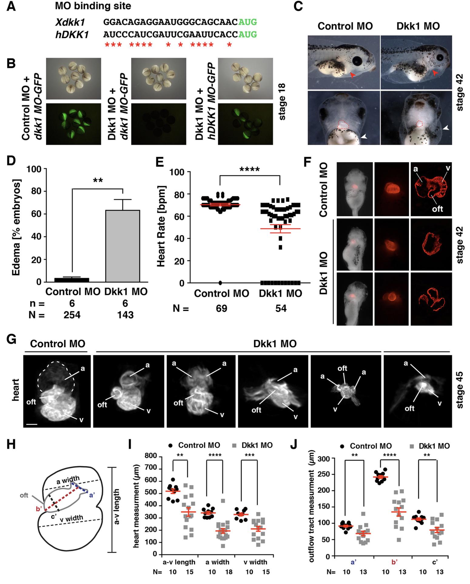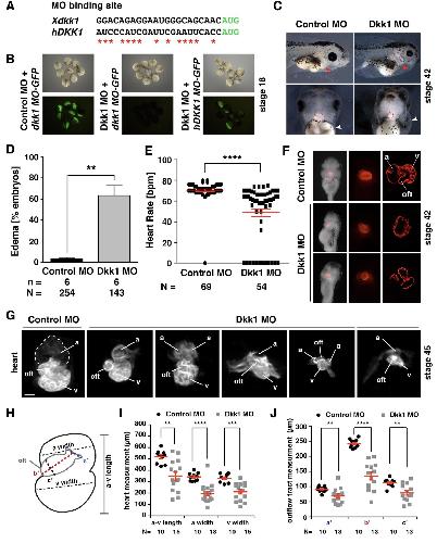 Fig. 3. Dkk1 depletion results in heart malformation and cardiac defects in Xenopus laevis. A. The sequence of Xenopus dkk1 and human DKK1 at the MO binding site. The start codon is marked in green. Red stars indicate the bases in the human DKK1 RNA that differ from Xenopus dkk1. B. Unilaterally injected Dkk1 MO but not Control MO blocked translation of the dkk1MO-GFP fusion construct. Dkk1 MO did not block translation of the hDKK1MO-GFP construct. C. Knocking down Dkk1 bilaterally with Dkk1 MO leads to deformed heart (red arrowhead in lateral view, red dotted line in front view) and cardiac edema (white arrowhead in front view) at stage 42. D. Quantitative presentation of the Dkk1 MO injected embryos with cardiac edema shown in C. E. Heart rate was significantly reduced in embryos with bilateral injection of Dkk1 MO. F-J. Analysis of the heart morphology in control embryos and Dkk1 depleted morphants. F. Representative images of stage 42 embryos showing normal heart morphology in one Control MO injected embryo and heart defects in two Dkk1 MO injected embryos. From left to right: ventral view of the embryos and heart stained for cardiac troponin T, close-up view of the hearts, sections through the hearts. G. Representative images of hearts isolated from bilaterally MO injected embryos. Atrial (a) width, ventricular (v) width, a-v length and outflow tract as illustrated in H were measured and presented in I and J, respectively. a: atrium, oft: outflow tract,v: ventricle. Mean values with standard errors are given. n = number of independent experiments, N = total number of embryos analyzed. *p < 0.05, **p < 0.01, ***p < 0.001, ****pâ¯<â¯0.0001 with Mann-Whitney rank sum test. |