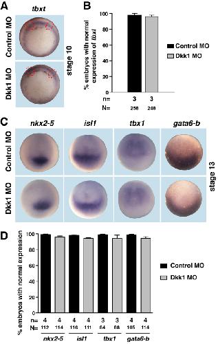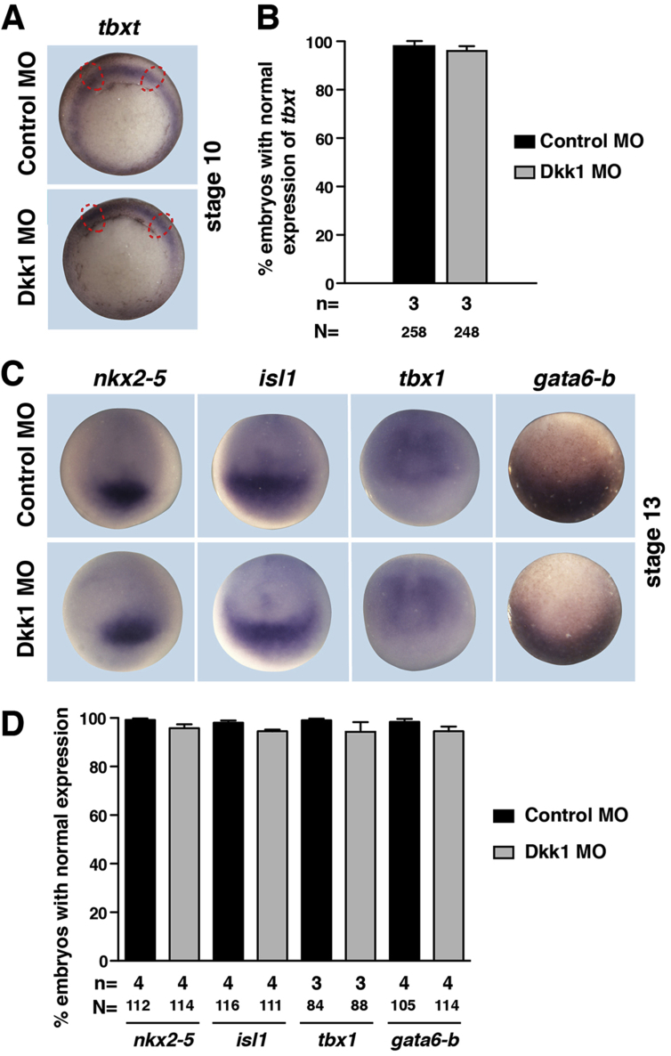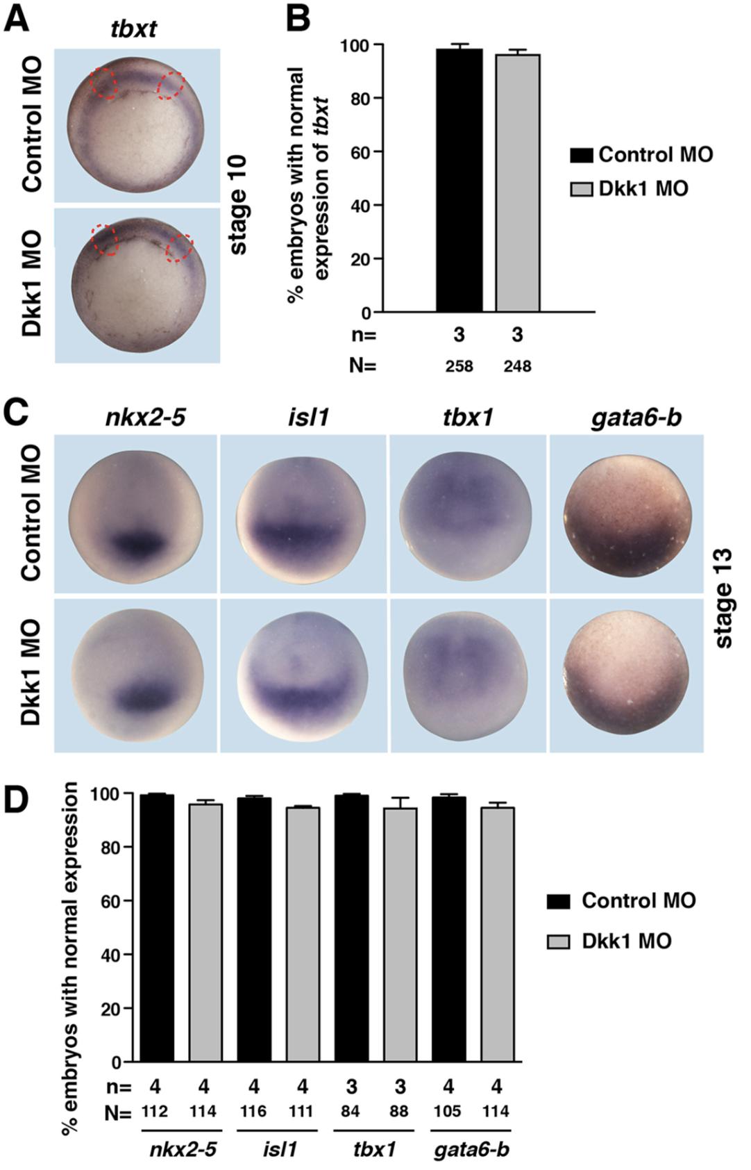 Supplement Fig. 4 Mesoderm formation and cardiac specification are not dependent on Dkk1. A. Expression of mesoderm marker tbxt is not affected upon Dkk1 knockdown. tbxt expression was analyzed at stage 10 embryos injected with Dkk1 MO or Control MO at stage 4. Red dotted circles indicate the location of the cardiac progenitor cell population induced at the onset of gastrulation. Quantification is shown in B. C. Expression of early cardiac markers is not altered upon Dkk1 depletion. Gene expression was analyzed at stage 13 embryos injected with Dkk1 MO or Control MO at stage 4. Quantification is shown in D. Mean values with standard errors are given. n = number of independent experiments, N = total number of embryos analyzed. |