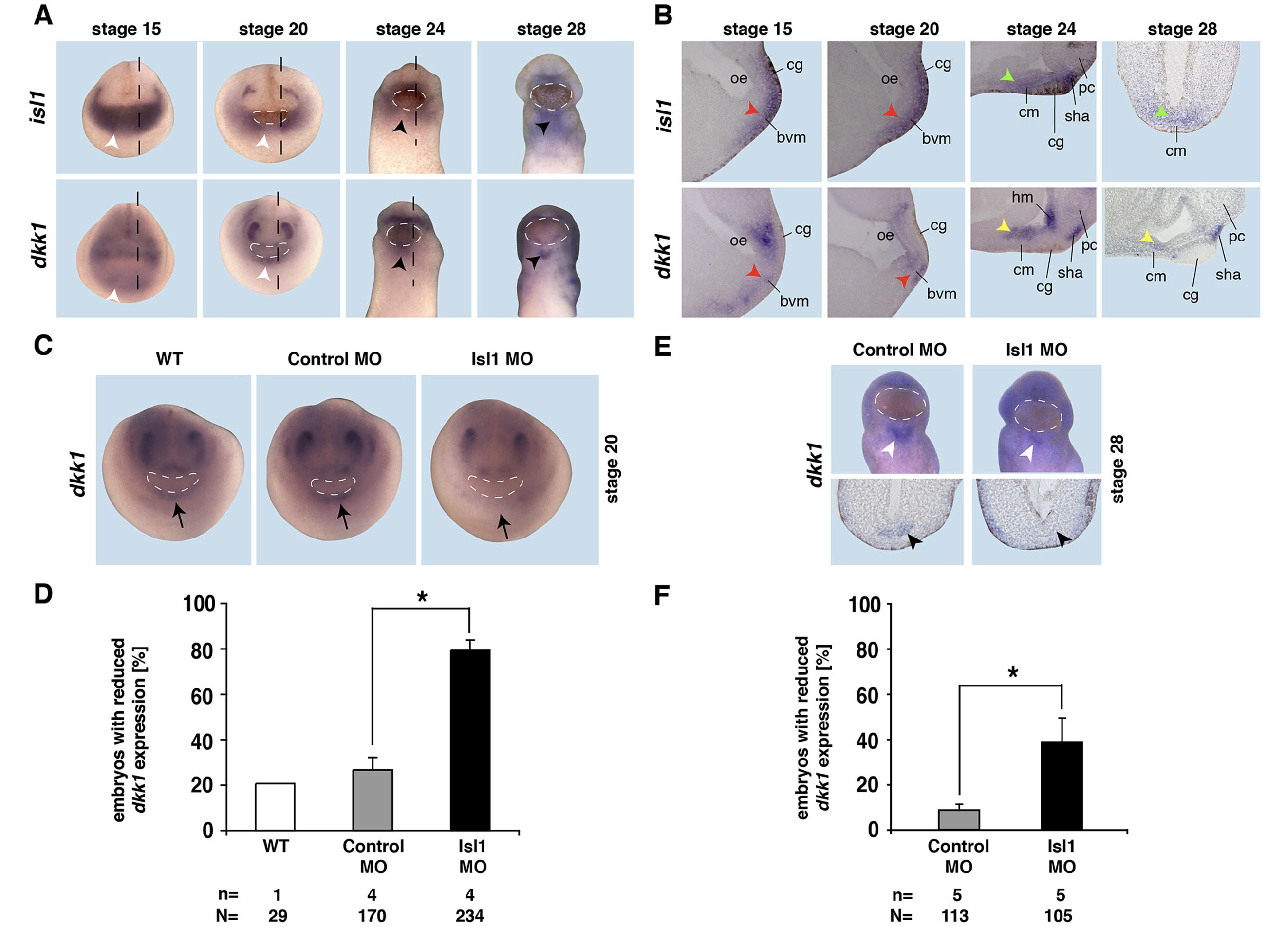 Fig. 2. Expression of dkk1 and isl1 and their regulation in early development of Xenopus laevis. A. WMISH shows the spatial expression of isl1 and dkk1 in early cardiogenesis. Both isl1 and dkk1 are present in the cardiac crescent at stage 15 (white arrowhead). At stage 20 (white arrowhead) and stage 24 (black arrowhead), dkk1 is expressed in the middle line where isl1 is absent. At stage 28, dkk1 is expressed in a small expression domain at the ventral midline, whereas isl1 covers a broader expression domain (black arrowheads). White dotted lines indicate the cement gland. Black dotted lines indicate the orientation of the sections shown in B. B. Parasaggital and cross sections reveal co-expression of dkk1 and isl1 in the border of ventral mesoderm (bvm, red arrowhead) and cardiac mesoderm (cm) (green arrowhead). At stages 24 and 28, dkk1 is expressed in the overlying endoderm (yellow arrowhead) in close proximity to the cardiac mesoderm. bvm: border of ventral mesoderm, cg: cement gland, cm: cardiac mesoderm, hm: head mesenchyme, oe: oral evagination, pc: prosencephalon, sha: stomodeal-hypophyseal anlage. C. Isl1 deletion leads to a reduced dkk1 expression at stage 20 (black arrow). Dotted lines indicate the cement gland. Quantification is presented in D. E. At stage 28 dkk1 expression is reduced at the ventral midline upon Isl1 knockdown (white and black arrowheads). Quantitative presentation is shown in F. Mean values with standard errors are given. n = number of independent experiments, N = total number of embryos analyzed. *pâ¯<â¯0.05 with Mann-Whitney rank sum test. |