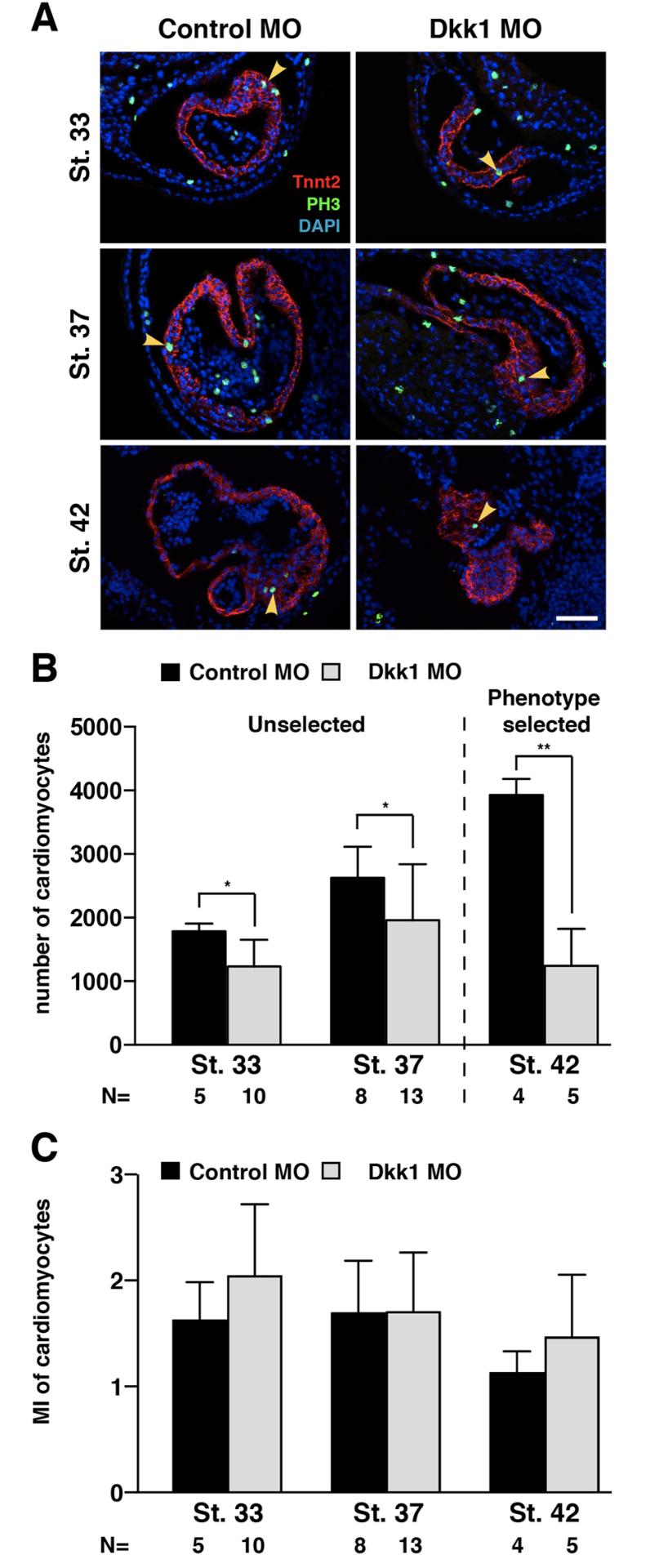 Fig. 4. Reduced number of terminally differentiated cardiomyocytes upon loss of Dkk1. A. Sections of embryos are shown stained for cardiac troponin T (red) to label cardiomyocytes and phosho-histone H3 (PH3, green) lo mark proliferating cells and counterstained with DAPI (blue) to highlight nuclei at the stages indicated. Yellow arrowheads indicate proliferating cardiomyocytes positive for cardiac troponin and phosho-histone H3. B. Cardiac troponin T positive cardiomyocytes were quantified on continuous serial sections of stained embryos. Embryos bilaterally injected with Dkk1 MO showed reduced number of cardiomyocytes at the stages indicated. C. The mitotic index (MI) as defined by the percentage of phosho-histone H3 positive cardiomyocytes is not affected upon Dkk1 MO injection. N = number of independent embryos counted. *p < 0.05, **pâ¯<â¯0.01, with Mann-Whitney rank sum test. Scale bar, 100â¯Î¼m. |