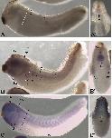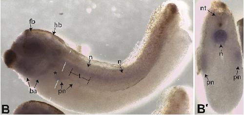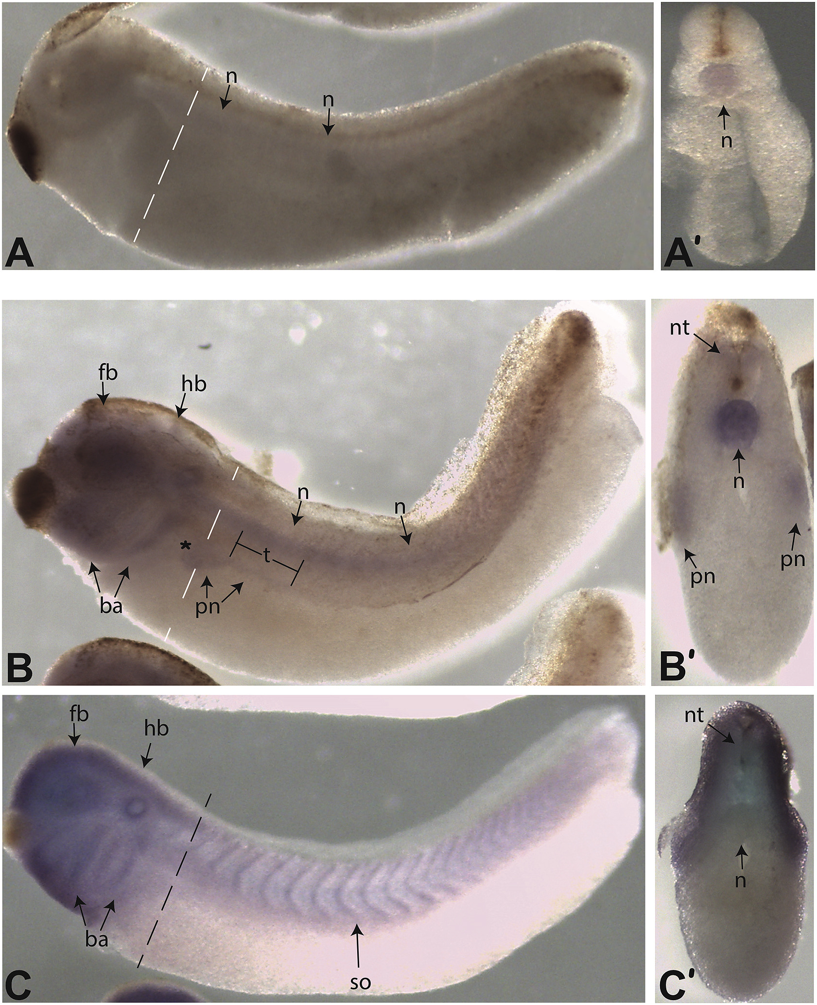 Fig. 4. The expression of gtpbp10 in late stages of development shown by whole-mount in situ hybridization (WISH). gtpbp10 antisense riboprobe was used for in situ hybridization on A) Early tail bud stage embryo (stage 28) and B) Late tail-bud stage (stage 36). Aâ² and Bâ² are transverse sections of the embryos shown in A and B at the level of the dotted white lines. Structures labeled as follows: notochord (n), neural tube (nt), forebrain (fb), hindbrain (hb), pronephros (pn), branchial arches (ba). * denotes the glomerulus and proximal tubules, while âtâ indicates the distal tubules. C) gtpbp10 sense probe shows background staining in the anterior branchial arches, otic vesicle, eye, and fore-, mid-, and hindbrain. Staining was also observed in somitic tissue (so) along the anterior-posterior axis.