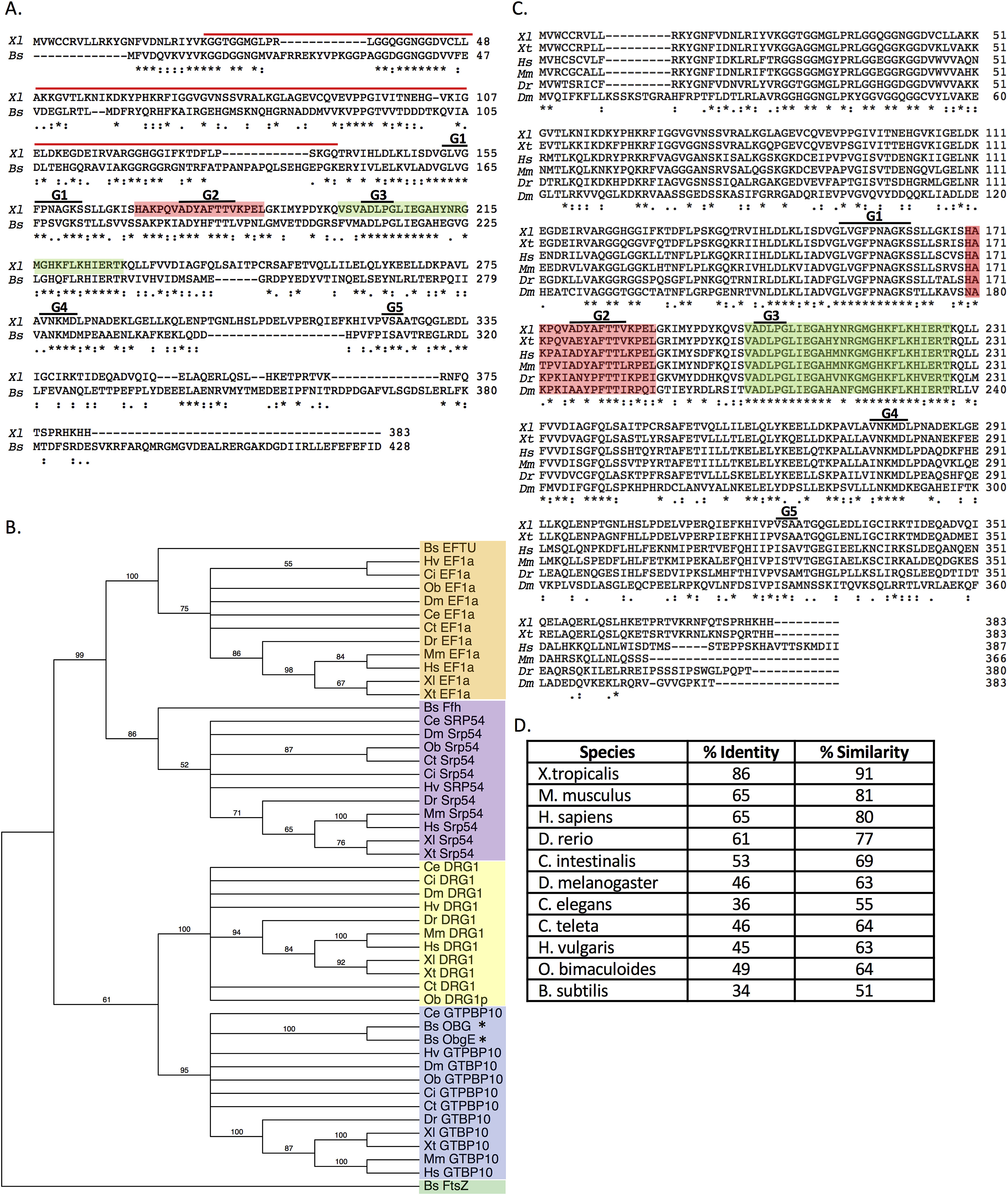 Fig. 1. Gtpbp10 is a member of the Obg family of G-proteins and is conserved among metazoans. A) Amino acid alignment of Xenopus laevis Gtpbp10 (Xl) with the prokaryotic ObgE protein from Bacillus subtilis (Bs). Glycine residues are conserved in the N-terminal glycine-rich domain (ObgE fold), amino acids 1–158 (red bar). Five conserved ‘G-box’ domains are denoted by black lines as G1-G5. Consensus sequences are as follows: G-box 1: GXXXXGK [T/S]; G-box 2: conserved T residue at position 177 (197 in B. subtilis); G-box 3: DXXG; G-box 4: [N/T]KXD; and G-box 5: [C/S]A [K/L/T]. The conserved Switch I and Switch II nucleotide binding and hydrolysis domains are denoted by red and green boxes, respectively. B) Phylogenetic tree representing maximum likelihood analysis of the P-loop GTPases Gtpbp10/ObgE (blue), Drg1/ObgE (yellow), Srp54/Ffh (purple), and EF-1a/EF-TU (orange). The outgroup is represented by B. subtilis FtsZ (Bs FtsZ, green). Species abbreviations: Ce: Caenorhabitis elegans, Ci: Ciona intestinalis, Ct: Capitella teleta, Dm: Drosophila melanogaster, Dr: Danio rerio, Ob_EF1a, Hs: Homo sapien, Hv: Hydra vulgaris, Mm: Mus musculus, Ob: Octopus bimaculoides, Xt: Xenopus tropicalis. Tree was assembled using PhyML 3.0 - ATGC-Montpellier (bootstrapping was set at 100). All alignments were created using Clustal Omega (EMBL-EBI). C) Amino acid alignment and comparison of Gtpbp10 from 6 metazoans. The Switch I and Switch II domains highlighted as above. D) Percent similarity and identity of selected Gtpbp10 orthologs from B (compared to Xenopus laevis), ObgE from B. subtilis shown for comparison.