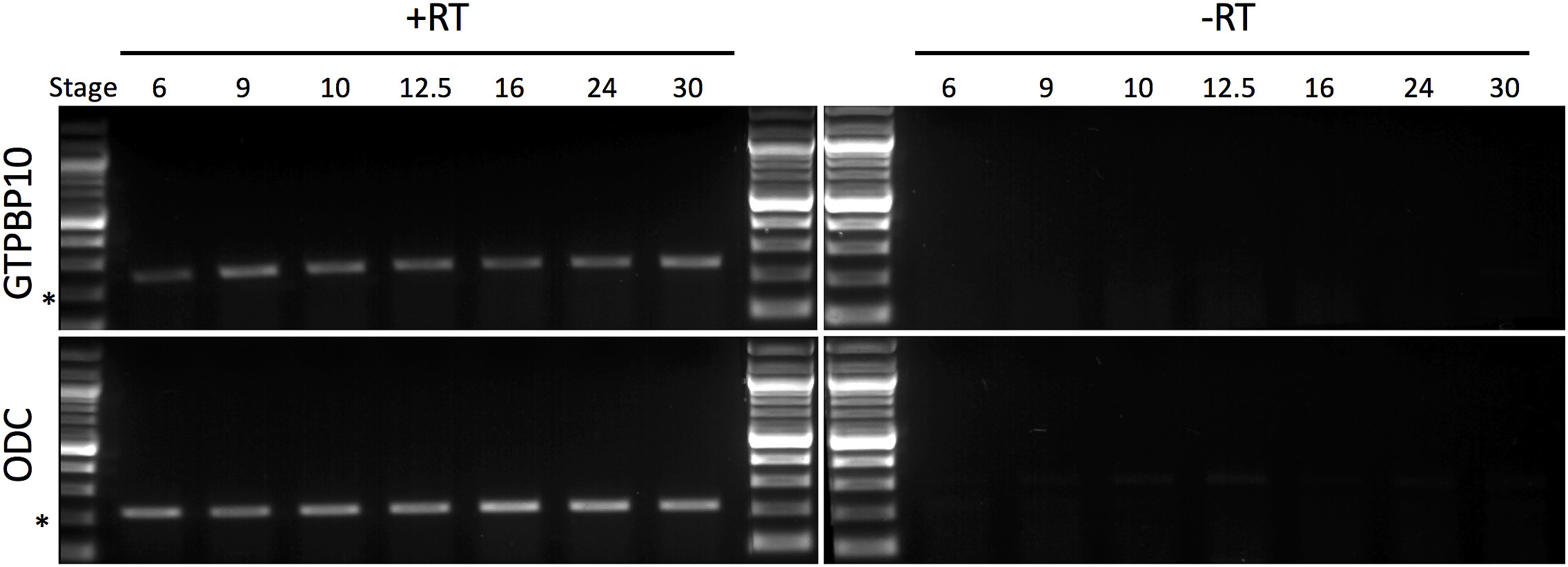 Fig. 2. GTPBP10 mRNA is expressed throughout development. RT-PCR was performed using RNA isolated from the indicated developmental stages. gtpbp10 migrates at 248bp, while ODC migrates at 221bp (200bp band indicated with an asterisk). ODC serves as a positive loading control. ‘-RT’ represents cDNA synthesis in the absence of reverse transcriptase (negative control).
