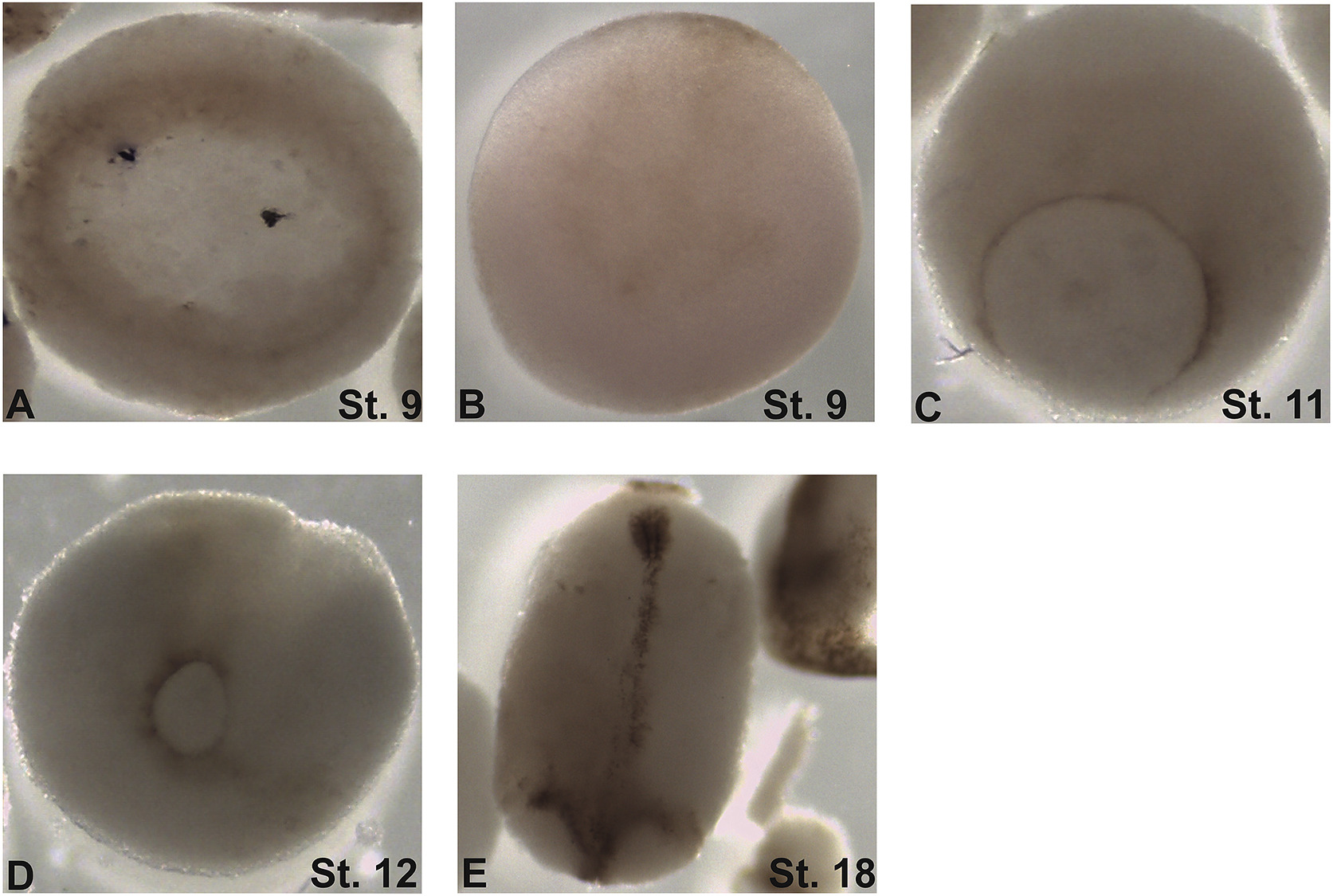 Fig. 3. Whole-mount in situ hybridization (WISH) indicates no early expression of gtpbp10. gtpbp10 antisense riboprobe was used for in situ hybridization on embryos of the indicated stages. A and B) Animal and vegetal views of stage 9 embryos (respectively), animal cap was removed for imaging in A. C and D) Dorsal-Vegetal view of stage 11 and 12 embryos, respectively, dorsal side is pointing up. E) Dorsal view of stage 18 embryo along the anterior-posterior axis (anterior up), the pigmented neural fold is shown, with incomplete closure in the anterior neuroectoderm.