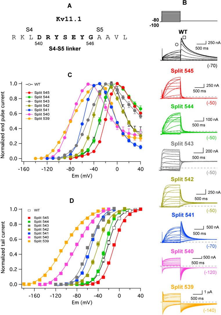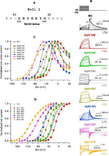 Fig. 1. Effect of split position displacement on activation voltage dependence of Kv11.1 split channels. a Kv11.1 sequence of the S4âS5 linker region. Linker boundaries are chosen based in the structural information provided by the cryo-EM architecture of Kv11.1 [60]. b Representative membrane currents from individual oocytes expressing the indicated channel variants submitted to 1-s depolarization pulses at different potentials at 10Â mV intervals form a holding potential of ââ80/ââ100Â mV, followed by a repolarization step as indicated at the top. Note the different repolarization potentials for different constructs as enclosed in parentheses at the end of the current traces. Currents recorded without leak subtraction are shown. WT continuous wild type. c Averaged I versus V relationships measured at the end of the depolarization step (signalled by the circle in the WT traces of b). Note the typical Kv11.1 n-shaped curves due to the strong rectification as a result of the slow activation and fast inactivation overlap at positive voltages. d Plots of normalized peak tail current magnitudes (square in the WT current traces of b) as a function of depolarizing voltage. Continuous lines are Boltzmann fits to the data as indicated in âMaterials and methodsâ section |