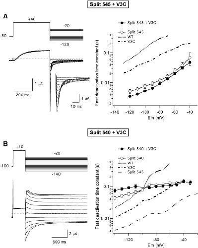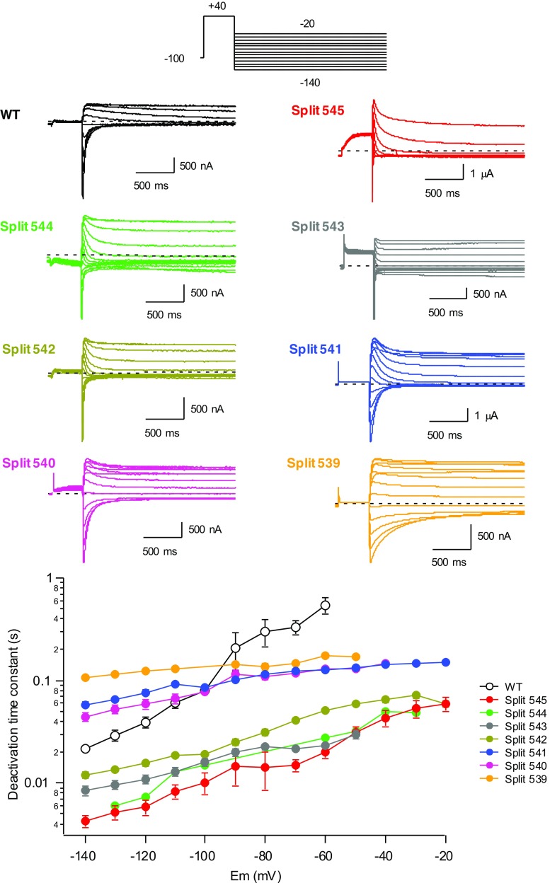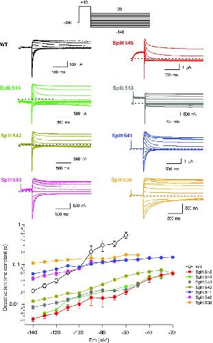 Fig. 3. Effect of split position displacement on voltage-dependent deactivation kinetics of Kv11.1 splits. Representative families of currents are shown at the top, obtained during steps to potentials ranging from ââ20 to ââ140Â mV in 10Â mV intervals, following depolarization pulses at +â40Â mV to open (and inactivate) the channels, using the indicated protocol. For clarity, only the first part of the 4-s repolarization steps used to follow the complete decay of the tail currents is shown. The dependence of deactivation rates on repolarization membrane potential is shown at the bottom. Deactivation time constants were quantified by fitting a double exponential to the decaying portion of the tails as described in âMaterials and methodsâ section. Only the magnitude of the deactivation time constant corresponding to the fast decaying major component of current at negative voltages is shown |