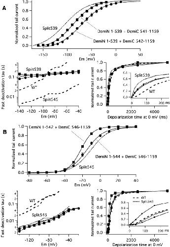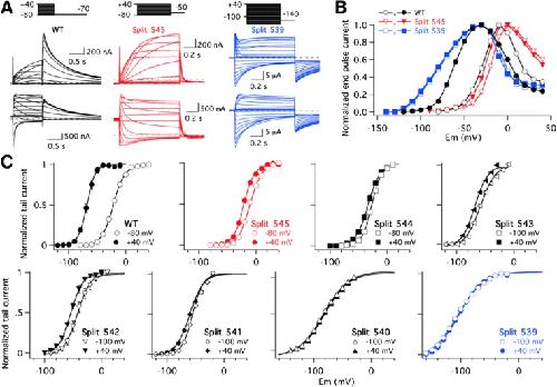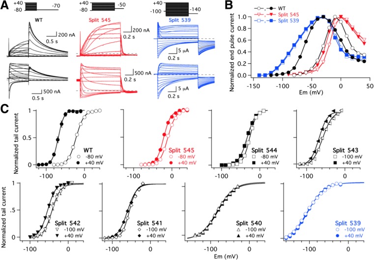 Fig. 6. Effect of S4âS5 linker interruptions on Kv11.1 ionic current mode shift. a Representative ion currents from continuous wild-type (WT) and splits 545 and 539 studied with the voltage protocols shown at ââ80/ââ100 (top) and +â40Â mV (bottom) holding potentials. b Averaged I versus V relationships from currents measured at the end of the variable depolarization step at different voltages as in panel a. Open and closed symbols correspond to data obtained in the same oocytes at hyperpolarized and depolarized holding potentials, respectively. c Plots of normalized peak tail current magnitudes as a function of depolarizing voltage for channels split at different positions along the S4âS5 linker. Data from continuous WT channels are also shown for comparison. Averaged values from four to eight cells are shown. Sometimes, error bars are smaller than the symbols. Continuous lines are Boltzmann fits to the data as indicated in âMaterials and methodsâ section. Hyperpolarized (open symbols) and depolarized (closed symbols) holding potential values are indicated in the graphs |