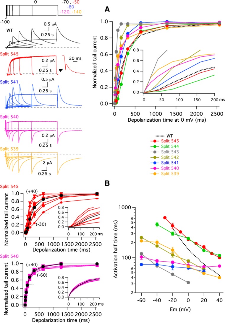 Fig. 2. Effect of split position displacement on Kv11.1 split voltage-dependent activation rates. a Comparison of time course of current activation at 0Â mV. Families of representative membrane currents from individual oocytes (left). The duration of a depolarizing prepulse to 0Â mV was varied as illustrated in the envelope-of-tail currents protocol at the top, illustrative of that used with WT channels, followed by a repolarization step to the indicated potentials (ââ70, ââ50, ââ80, ââ120 and ââ140Â mV for WT, split 545, split 541, split 540 and split 539 variants, respectively). Cells expressing split 539 and split 540 channels were held at ââ140 and ââ120Â mV trying to ensure that they also start in deactivated state. An enhanced view of the very rapidly deactivating split 545 tail current at the end of the 2560-ms depolarizing step is shown in the inset. Averaged plots of normalized tail current magnitudes versus depolarization time at 0Â mV (right). Values from continuous wild-type channels are shown as a dotted line for comparison. An expansion of the initial 200Â ms to highlight the progressive disappearance of the early current delay in the sigmoidal activation time course is shown in the inset. b Comparison of activation rate voltage dependence. Plots of normalized tail current magnitudes versus depolarization times at voltages between ââ30 and +â40Â mV (split 545) or ââ60 and +â40Â mV (split 540) at 10 and 20Â mV intervals were generated from current traces as indicated in a (left). These plots were used to measure times necessary to attain half-maximum current magnitudes (dotted lines). Expanded views of the initial 250Â ms of the plots are shown in the insets. Data obtained at 0Â mV are represented in black. Dependence of activation rates on depolarization membrane potentials (right). The time necessary to attain half-maximum tail current magnitude is plotted versus depolarization potential. Values from continuous wild-type channels are shown as a dotted line for comparison |