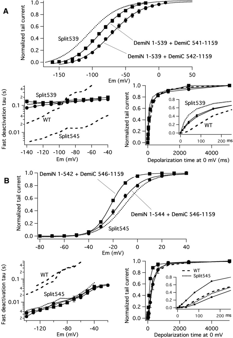 Fig. 4. Functional properties of split channels carrying partial S4-S5 linker deletions around the disconnection point between the VSD and the PD. a Activation and deactivation gating kinetics of split 539 channels lacking Asp540 or Asp540 plus Arg541 residues. Activation voltage dependence (top). Fractional activation curves were obtained from oocytes co-expressing 1â539 plus 541â1159 or 1â539 plus 542â1159 demi-channel combinations (that will lack D540 or D540 plus R541 residues, respectively), using tail current data as detailed in Fig. 1 for split 539. Continuous lines are Boltzmann curves that best fitted the data as indicated in âMaterials and methodsâ section. A Boltzmann curve from non-deleted split 539 channels as in Fig. 1d is also shown for comparison. Analogy of deactivation kinetics between L539 split channels with and without residues D540 and D540 plus R541 (bottom left). Deactivation time constants were quantified from double exponential fits to the tails as in Fig. 3 (see also âMaterials and methodsâ section). Plots of deactivation time constants for the fast decaying component of the currents as a function of membrane potential are shown. Data from 1 to 539 plus 541â1159 (squares) and 1â539 plus 542â1159 (circles) demi-channel combinations appear superimposed to those from non-deleted split 539 channels (dotted line). Data from continuous wild-type and split 545 channels are also shown as dashed lines for comparison. Comparison of activation rates at 0Â mV (bottom right). Averaged plots of normalized tail current magnitudes versus depolarization time at 0Â mV are shown from 1 to 539 plus 541â1159 (squares) and 1â539 plus 542â1159 (circles) demi-channel combinations. An expansion of the initial 200-ms time course is shown in the inset. Data from continuous wild-type (dashed line) and non-deleted split 539 channels (dotted line) are also shown for comparison. b Activation and deactivation gating kinetics of split 545 channels lacking either Tyr545 or the Ser543 + Glu544 + Tyr545 segment. Analysis of activation voltage dependence (top), deactivation kinetics (bottom left) and the time course of current activation at 0Â mV (bottom right) were performed as detailed in a. Data from oocytes expressing the 1â544 plus 546â1159 (lacking only the Y545 residue, circles) and the 1â542 plus 546â1159 (lacking the S543 + E544 + Y545 triplet, squares) demi-channel combinations are depicted. Due to the low level of expression obtained with the Y545-deleted construct, a high-K+ extracellular solution was used for the 1â542 plus 546â1159 combination recordings (see âMaterials and methodsâ section). Data from continuous wild-type (dotted lines) and non-deleted split 545 channels (dashed lines) are also shown. In both cases, the traces indicating the slowest time constants correspond to data obtained in high-K+ extracellular solution |