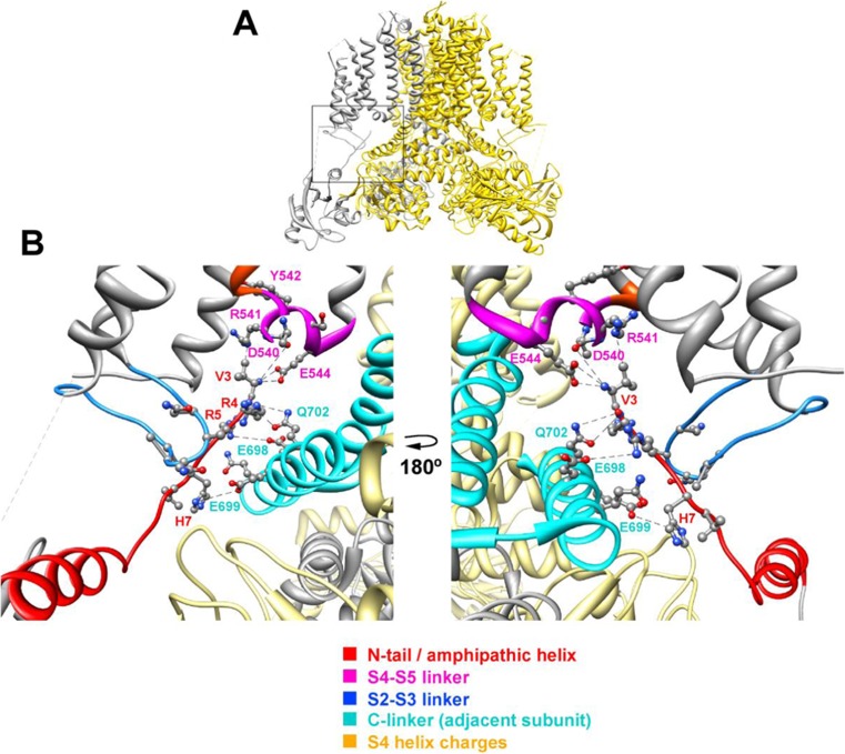 Fig. 8. Close apposition and interactions of the Kv11.1 N-tail with the S4âS5, S2âS3 and C-linkers of the channel. a Lateral view of the Kv11.1 tetrameric structure ([60] PDB code 5VA2). A highlighted subunit is coloured in gray. b Enhanced view of the region inside the signalled square in a with ribbons corresponding to the indicated domains and residue symbols coloured as shown at the bottom. Lateral chains of the selected residues are shown as ball and stick with oxygen and nitrogen atoms as red and blue spheres. Dashed lines indicate interatomic distances ranging between 3.0 and 5.4Â Ã . Structures were processed with UCSF Chimera [39] |