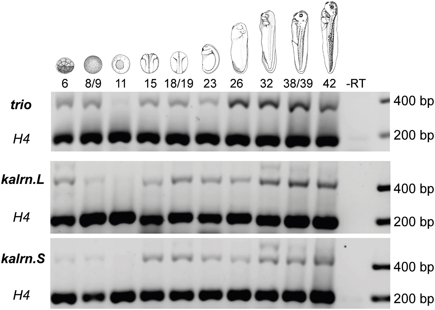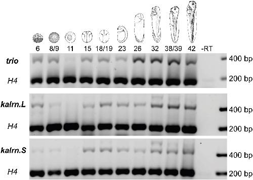 Fig. 3. Temporal gene expression pattern of Xenopus laevis trio and kalrn. Expression levels were determined by RT-PCR at different stages of Xenopus laevis development. Amplification of Histone H4 (H4) was used as an internal control. Reactions performed in the absence of reverse transcriptase (-RT) served as negative control. The temporal expression pattern of trio (upper lane), kalrn.L (middle lane) and kalrn.S (lower lane) are shown.