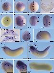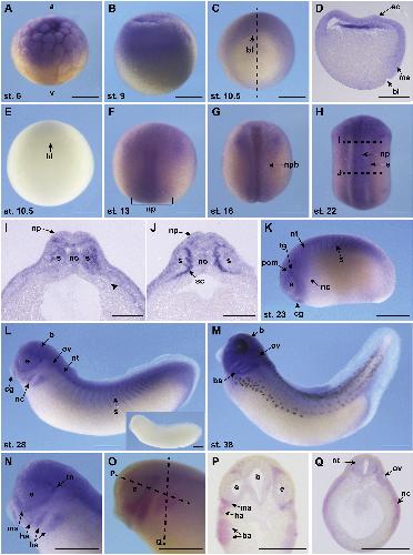 Fig. 4. Spatial gene expression pattern of trio. Trio gene expression was analyzed by whole mount in situ hybridization. Embryonic stages are indicated. The detailed expression pattern is described in the text. A Embryo at cleavage stage, lateral view. B Blastula stage embryo, lateral view. C Gastrula stage embryo, blastopore lip is indicated. D Transverse section of embryo in C; section plane is indicated in C. E Control in situ hybridization using a sense trio probe; gastrula stage embryo. F,G Neurula stage embryos, dorsal view. H Tailbud stage embryo, dorsal view. I,J Transverse sections of embryo shown in H. Section planes are indicated in H. Arrowhead in I marks staining between the meso- and endoderm likely representing migrating NC cells. K-M Tailbud stage embryos, lateral view. Sense control at stage 28 is indicated in the insert in L. N Higher magnification of the head of the embryo shown in L. O Double in situ hybridization showing trio (blue) and twist (red) co-expression in cranial NC cells. P, Q Transverse sections of tadpole embryos analyzed by trio/twist double in situ hybridization. Section planes are indicated in O. Abbreviations: a: animal, b: brain; ba: branchial arches; bl: blastopore lip; cg: cement gland; e: eye; ec: ectoderm; ha: hyoidal arch; ma: mandibular arch; me: mesoderm; nc: neural crest; no: notochord; np: neural plate; npb: neural plate border; nt: neural tube; ov: otic vesicle; s: somites; pom: periocular mesenchyme; sc: sclerotome; tg: trigeminal ganglion; v: vegetal. Scale bar: 500â¯Î¼m (I,J: 200â¯Î¼m).
