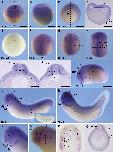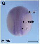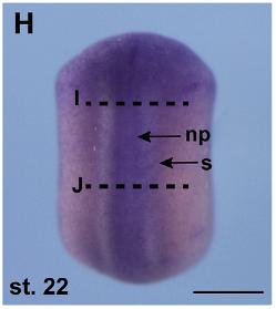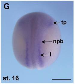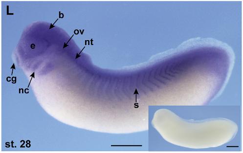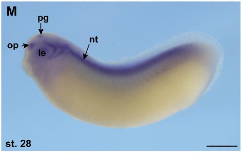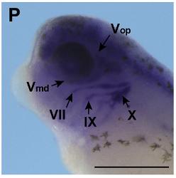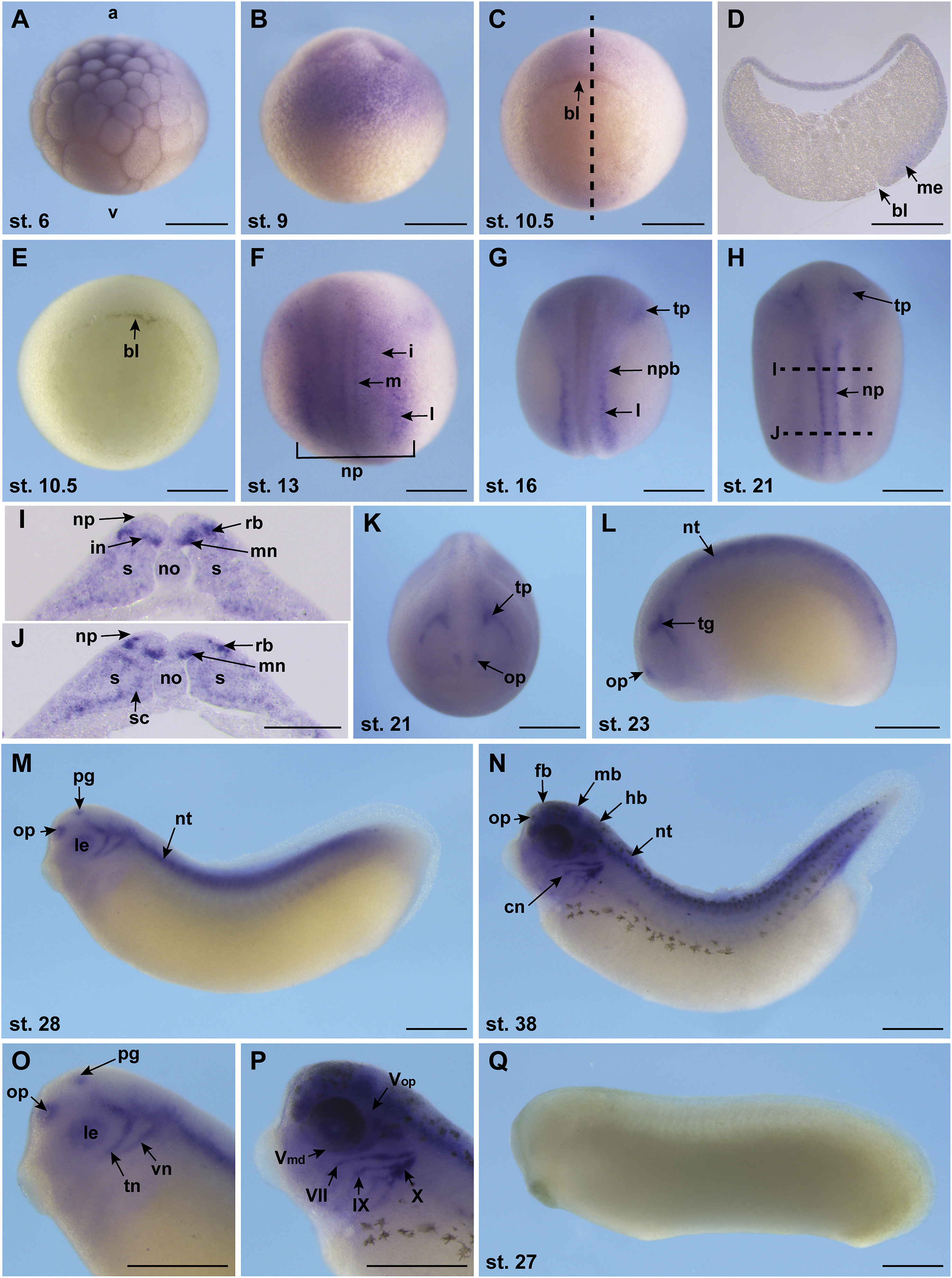 Fig. 5. Spatial gene expression pattern of kalrn. Kalrn gene expression was analyzed by whole mount in situ hybridization. Embryonic stages are indicated. The detailed expression pattern is described in the text. A Embryo at cleavage stage, lateral view. B Blastula stage embryo, lateral view. C Gastrula stage embryo, blastopore lip is indicated. D Transverse section of embryo in C; section plane is indicated in C. E Sense control of gastrula stage embryo. F-H,K Neurula stage embryos, dorsal view. I,J Transverse sections of embryo shown in H. Section planes are indicated in H. K Anterior view of embryo shown in H. M-N Tailbud stage embryos, lateral view. O,P Higher magnification of the embryo heads shown in M,N, respectively; the mandibular branch (Vmd) and the ophthalmic branch (Vop) of the trigeminal nerve (V), the facial VII, the glossopharyngeal (IX), and the vagus (X) nerve are indicated in P. Q Control in situ hybridization using a sense trio probe; tailbud stage embryo. Abbreviations: a: animal; bl: blastopore lip; cn: cranial nerves; fb: forebrain; hb: hindbrain; i: intermediate domain of primary neurons; in: interneuron; l: lateral domain of primary neurons; le: lens; m: medial domain of primary neurons; mb: midbrain; me: mesoderm; mn: motor neuron; no: notochord; np: neural plate; npb: neural plate border; nt: neural tube; op: olfactory placode; pg: pineal gland; rb: Rohon-Beard neuron; s: somites; sc: sclerotome; tg: trigeminal ganglion; tn: trigeminal nerve; tp: trigeminal placode; v: vegetal; vn: vestibulo cochlear nerve. Scale bar: 500â¯Î¼m (I,J: 200â¯Î¼m).