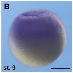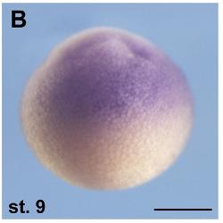 trio (trio Rho guanine nucleotide exchange factor) gene expression in Xenopus laevis embryo, assayed via in situ hybridization, NF stage 9, lateral view, animal side up.