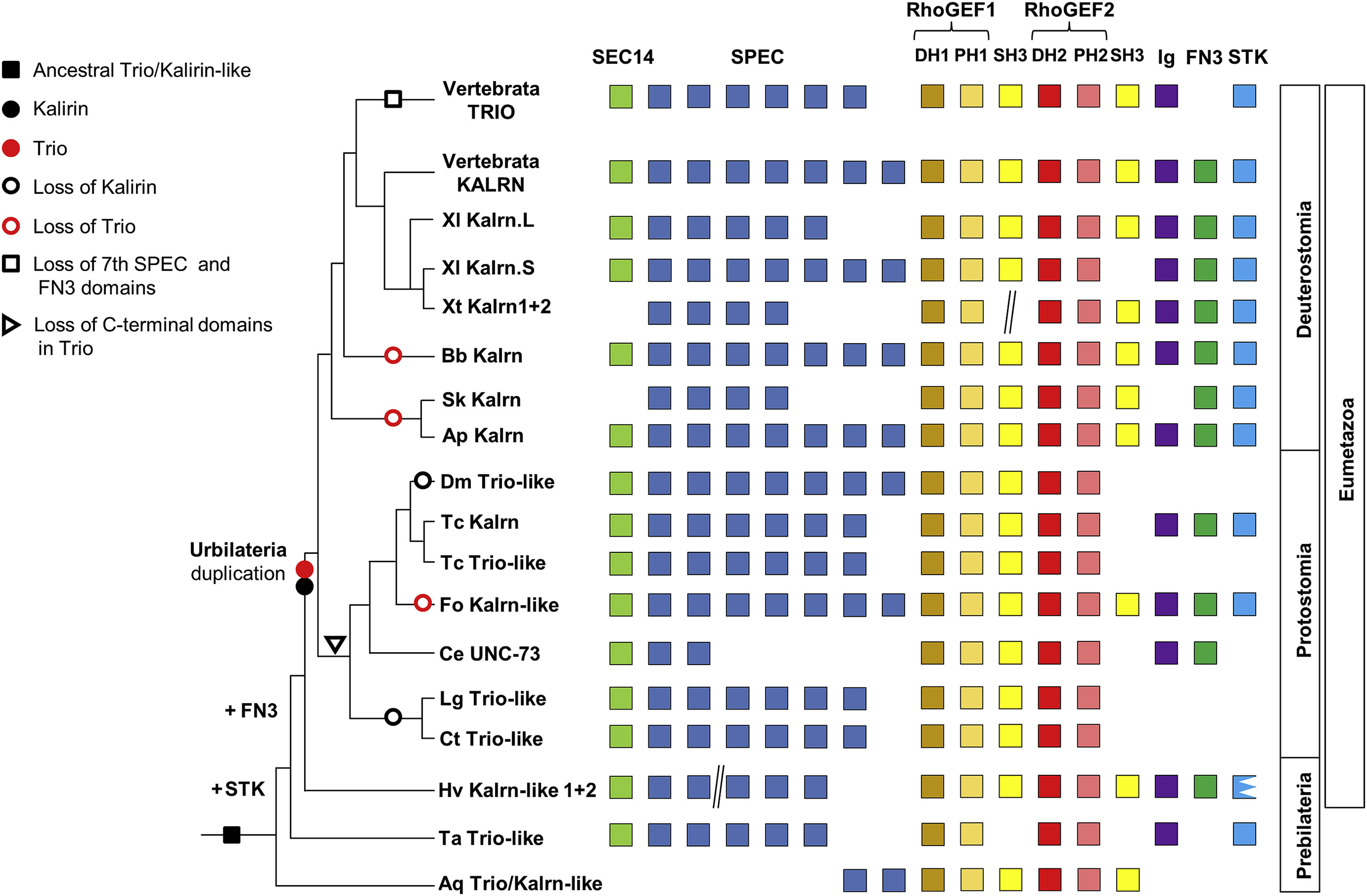 Fig. 1. Graphical summary of the protein domain structures of Kalrn and Trio using an idealized animal tree of life. The tree reflects the currently accepted phylogeny of animals. Different protein domains are indicated by color. (The domain architecture of different Kalrn/Trio proteins in respect to protein length (in amino acids) is depicted in Supplementary Fig. 2). Species abbreviation Ap: Acanthaster planci; Aq: Amphimedon queenslandica; Bb: Branchiostoma belcheri; Ce: Caenorhabditis elegans; Ct: Capitella teleta; Dm: Drosophila melanogaster; Fo: Frankliniella occidentalis; Hv: Hydra vulgaris; Lg: Lottia gigantea; Lg: Sk: Saccoglossus kowalevskii; Ta: Trichoplax adhaerens; Tc: Tribolium castaneum; Xl: Xenopus laevis; Xt: Xenopus tropicalis.//indicate a gap in the protein domain structure, as two shorter fragments were assembled for graphical representation.