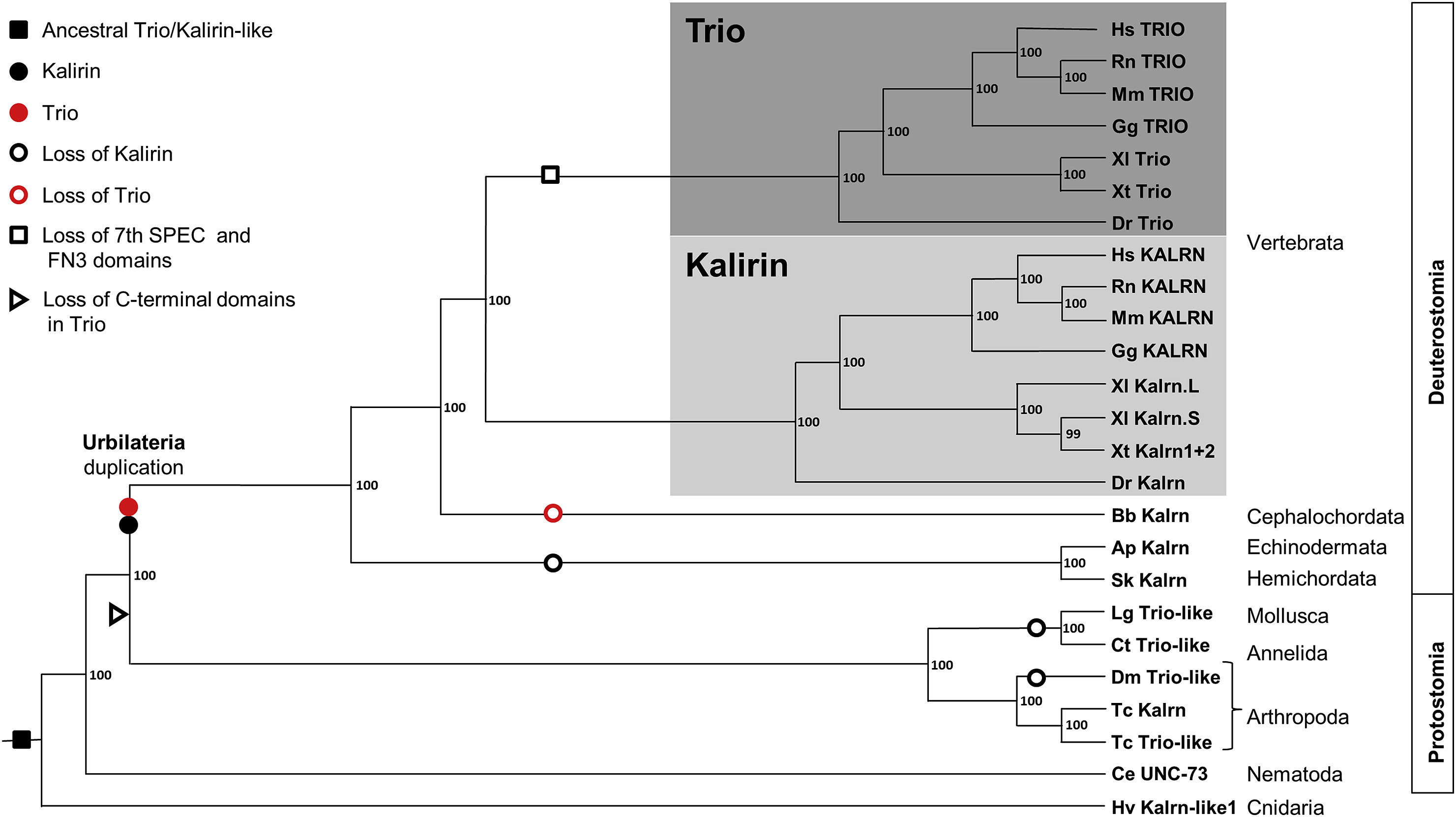 Fig. 2. Bayesian phylogenetic tree of vertebrate and invertebrate Kalrn and Trio. Species abbreviation as in Fig. 1. Accession numbers are given in Supplementary Table 1.