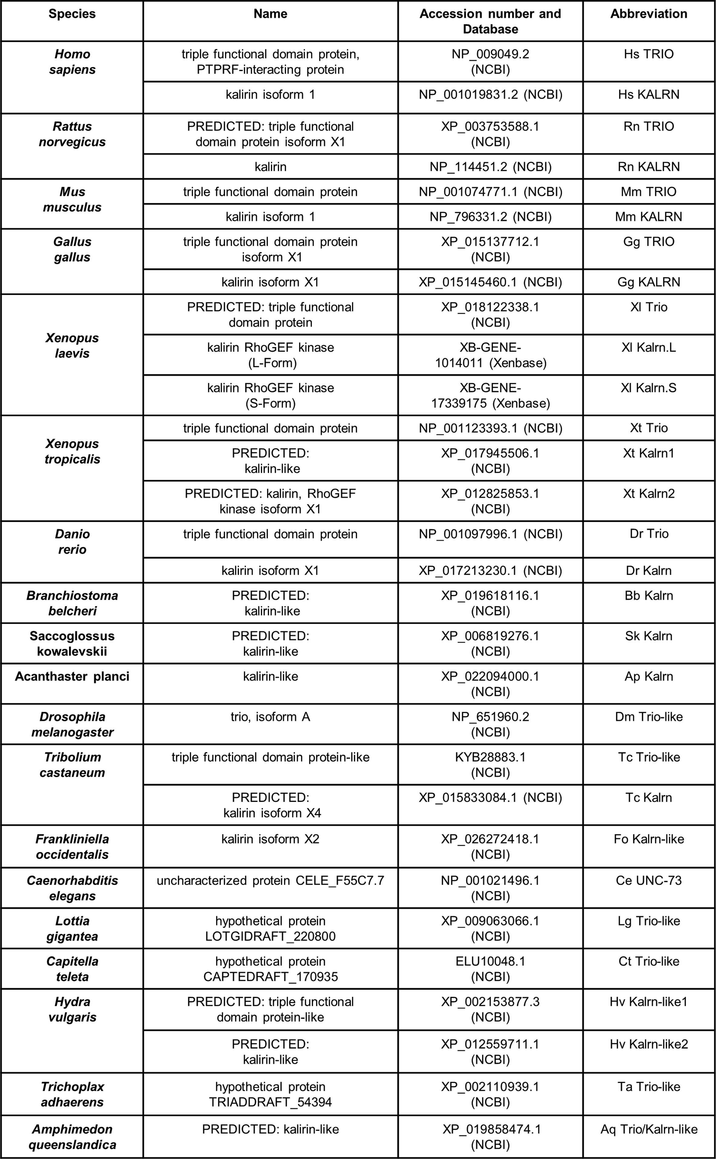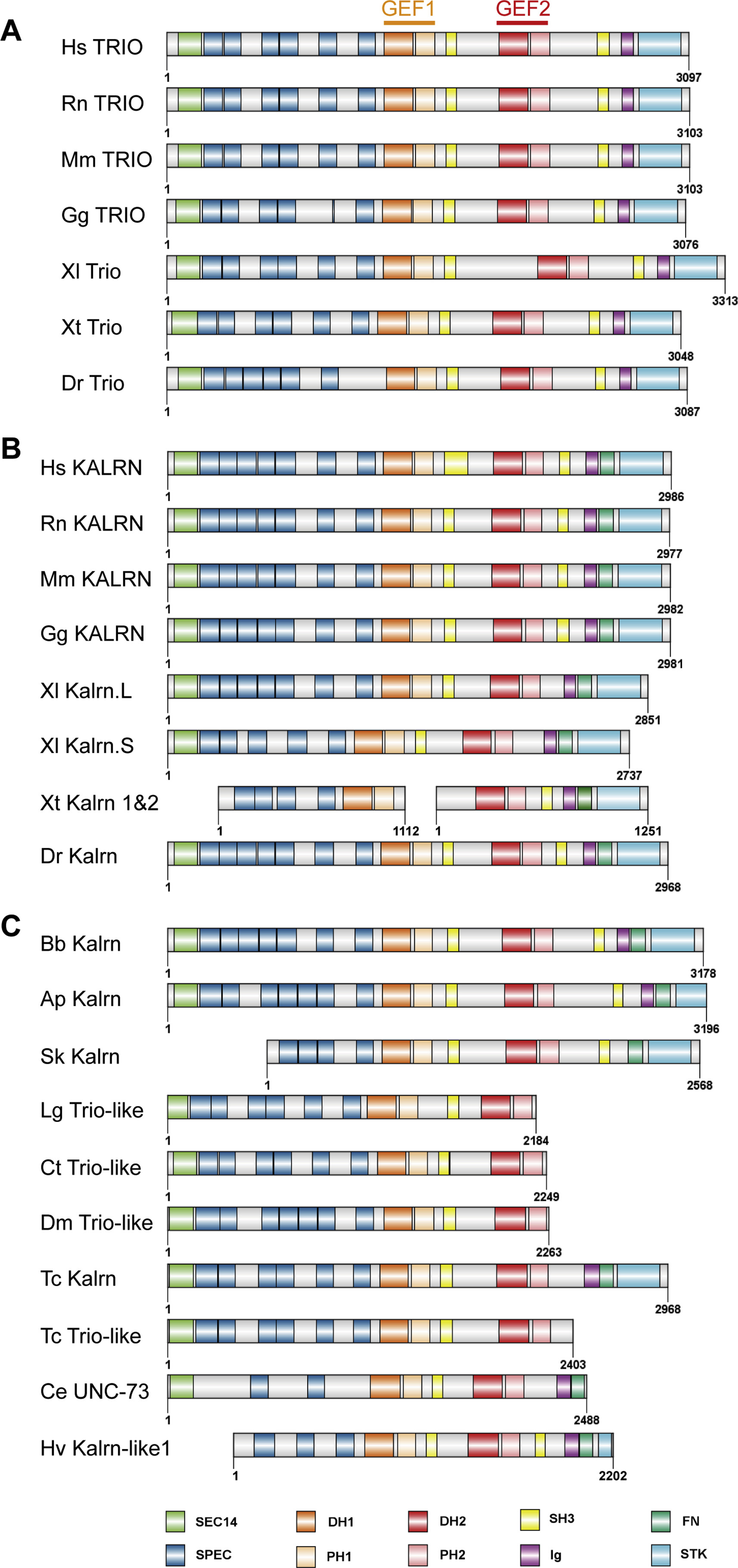 FigS2. A Vertebrate Trio proteins. B Vertebrate Kalrn proteins. C Invertebrate Trio/Kalrn orthologs. Different protein domains are indicated by color. Protein length is depicted representing number of amino acids (indicated on the right).