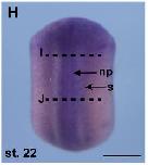 Fig. 6. Kalrn is co-expressed with n-tubulin in different neurons. Kalrn (blue) and n-tubulin (red) co-expression was analyzed by double whole mount in situ hybridization. A Neurula embryo (stage 13) analyzed by in situ hybridization using a kalrn antisense probe. B Stage 13 embryo analyzed by kalrn (blue) and n-tubulin (red) double in situ hybridization. C Transverse section of the embryo seen in A. D Transverse section of the embryo seen in B shows that the purple areas expressing kalrn and n-tubulin significantly overlap with the kalrn expression in C. Abbreviations: i: intermediate domain of primary neurons; l: lateral domain of primary neurons; m: medial domain of primary neurons; n-tub: n-tubulin; no: notochord; np: neural plate. Scale bar: A,B: 500â¯Î¼m; C,D: 200â¯Î¼m.