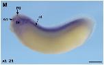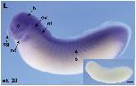 trio (trio Rho guanine nucleotide exchange factor) gene expression in Xenopus laevis embryo, assayed via in situ hybridization, NF stage 28, lateral view, anterior left, dorsal up.
