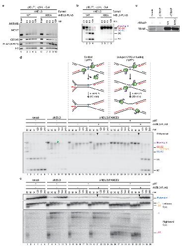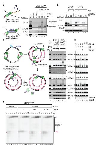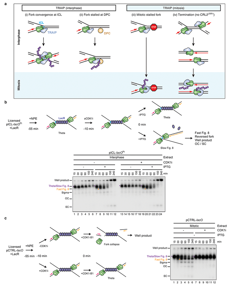 Extended Data Fig. 10 |. Model of TRAIPâs action in interphase and mitosisa, TRAIP (blue) travels with the replisome and associates with CMG, directly or indirectly (i-iv, top). In interphase, TRAIP is oriented such that its E2 (whose identity is unknown) points ahead of the replisome. As a result, TRAIP cannot ubiquitylate the CMG it is associated with, but it can ubiquitylate any protein that lies in the replisomeâs path. TRAIP can thus ubiquitylate CMG in trans when two replisomes meet (i), and it can ubiquitylate DPCs that block the path of the replisome (ii). We speculate that TRAIP ubiquitylates any proteinaceous structure that causes extended stalling of the replisome. In mitosis, TRAIP undergoes a conformational change so that it can ubiquitylate the CMG with which it is associated in cis. As a result, in mitosis, stalled forks undergo TRAIP-dependent CMG ubiquitylation in the absence of fork convergence (iii) (Deng et al., in press). We propose that TRAIP does not ubiquitylate terminated CMGs in interphase because they rapidly move past each other29, precluding ubiquitylation by the forward-pointing TRAIP (iv, middle). However, upon mitotic entry, terminated CMGs undergo TRAIP-dependent ubiquitylation in cis (iv, bottom)(Deng et al., in press). Importantly, TRAIP-dependent CMG unloading in interphase egg extracts is not dependent on residual CDK1 activity (b and c), indicating that TRAIP is regulated differently in interphase and mitosis.b, In interphase egg extracts, TRAIP travels with DNA replication forks but ubiquitylates CMGs only when forks converge. In the presence of Cyclin B1-CDK1, TRAIP is activated in the absence of fork convergence (Deng et al., in press)(summarized in a). We therefore wanted to know whether TRAIP-dependent CMG unloading in interphase egg extract depends on residual CDK1 activity. Top, reaction scheme to determine whether the action of TRAIP at ICLs in interphase egg extract requires residual CDK1 activity. Replication of pICL-lacOPt with a pre-assembled LacR array was initiated by addition of NPE (â55 min). Forty-five min after initiation (â10 min), reactions were supplemented with buffer or the CDK1 inhibitor RO-3306 (CDK1i) and allowed to incubate for an additional 10 min; CDK1i was added late to avoid inhibition of replication initiation. The LacR array was then released with addition of IPTG to trigger fork convergence and ICL repair (0 min). In a control, buffer instead of IPTG was added to maintain the LacR array and thereby prevent fork convergence. At the indicated times after IPTG addition, samples were collected and analyzed as in Fig. 1b to look for evidence of CMG unloading and ICL processing. Bottom, experiment described in top scheme. Fork stalling at the boundaries of the LacR array lead to a theta structure (lanes 1, 7, 13, 19). Upon addition of IPTG, theta was converted to Slow Figure 8, Fast Figure 8 (co-migrating with theta), and well product with equal efficiency in the presence and absence of CDK1i (compare lanes 7-12 and 19-24). The data suggest that CDK1 is not required for CMG unloading or ICL repair.c, Left, reaction scheme of a control experiment to ensure that the addition of CDK1i in b blocked CDK1 activity. As recently described (Deng et al., in press), when replication forks are stalled at a LacR array, the subsequent addition of Cyclin B1-CDK1 promotes TRAIP-dependent CMG unloading and fork breakage, alternative end joining, and the formation of aberrant replication products that migrate in the well of an agarose gel. To verify that CDK1 was effectively inhibited in a, we used this CDK1-dependent well-product formation as an assay. To this end, replication of pCTRL-lacO with a pre-assembled LacR array was initiated (â55 min) by addition of NPE. Forty-five min after initiation (â10 min), reactions were supplemented with CDK1i or buffer and allowed to incubate for an additional 10 min. Cyclin B1-CDK1 was then added to activate fork breakage and well product formation (0 min). Right, experiment described in left scheme. As expected, addition of Cyclin B1-CDK1 in the absence of CDK1i led to the formation of well products (lanes 25-30) but not in the presence of CDK1i (lanes 31-36). Note that the experiments in b and c were performed in parallel; extracts were aliquoted for the various conditions described at 0 min. Therefore, the CDK1i effectively inhibited CDK1-dependent activation of TRAIP. We conclude that TRAIP activation at ICLs does not depend on residual CDK1 activity. |