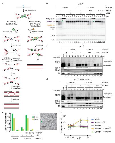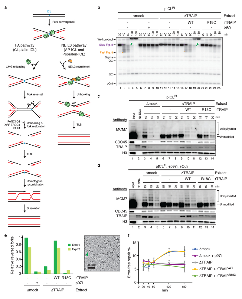 Fig. 1 |. CMG unloading at ICLs requires the E3 ubiquitin ligase TRAIPa, Models of ICL repair by the FA (left branch) and NEIL3 (right branch) pathways. TLS, translesion DNA synthesis; AP, abasic site.b, pICLPt was replicated in egg extracts containing [α-32P]dATP. Replication intermediates were resolved by native agarose gel electrophoresis and visualized by autoradiography. Recombinant TRAIPWT, rTRAIPR18C, and p97 inhibitor NMS-873 (p97i) were added as indicated. OC, open circular; SC, supercoiled; pQnt, undamaged control plasmid; Purple dot, Slow Figure 8; Orange dot, Fast Figure 8; Green arrowhead, reversed fork (see Extended Data Fig. 1b for discussion). For TRAIP levels in extracts, see Extended Data Fig. 2d.c and d, Analysis of proteins associated with pICLPt during replication in the indicated extracts in the absence (c) or presence (d) of p97i and Cullin RING ubiquitin ligase inhibitor MLN4924 (Culi). Culi was added to eliminate ubiquitylation by CRL2LRR1 (see Extended Data Fig. 4d). For TRAIP levels in extracts, see Extended Data Fig. 2i. Residual MCM7 ubiquitylation in the presence of R18C was observed in eight independent experiments (e.g. Fig. 3c). Histone H3, recovery control.e, Left, pICLPt was replicated for 90 min in the indicated extracts, and the relative abundance of reversed forks, as determined by electron microscopy, was quantified. Values were normalized to the mock-depleted extract. Error bars, range from two independent experiments. Right, representative electron micrograph of a reversed fork (green arrowhead) from TRAIP-depleted extract supplemented with rTRAIPWT. For TRAIP levels in extracts, see Extended Data Fig. 3g.f, Error-free repair as measured by regeneration of a SapI restriction site coinciding with the ICL. The ~7% basal SapI cutting is due to contaminating undamaged plasmid8. Error bars, standard error of the mean from three independent experiments. For TRAIP levels in extracts, see Extended Data Fig. 3h. |