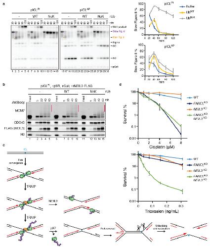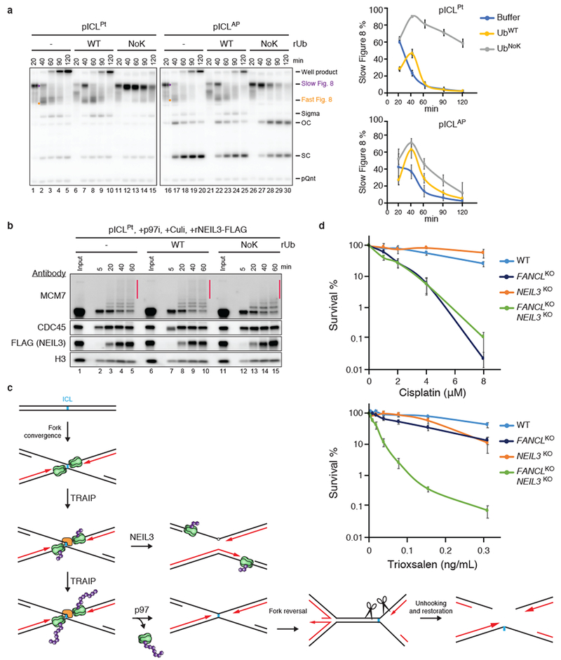 Fig 4 |. MCM7 ubiquitin chain length influences ICL repair pathway choicea, Left, replication of pICLPt or pICLAP in undepleted extract supplemented with buffer, UbWT, or UbNoK was analyzed as in Fig. 1b. Right, Slow Figure 8 structures quantified as a percentage of total replication products. Note that UbWT and UbNoK delayed replication by ~20 minutes. Error bars, standard error of the mean from three independent experiments.b, Proteins associated with pICLPt during replication in undepleted extract in the presence of p97i and Culi and UbWT or UbNoK, as indicated. Black bar, longer ubiquitin chains sensitive to UbNoK addition.c, Model for hierarchical activation of the NEIL3 and FA pathways by TRAIP. Green, CMG helicase; purple, ubiquitin; orange, NEIL3.d, Clonogenic survival of wild-type, FANCL, NEIL3, or FANCL/NEIL3 CRISPR knockout HAP1 cells after exposure to cisplatin (top) or trioxsalen and UV-A irradiation (bottom). Error bars, standard error of the mean from at least three independent experiments. |