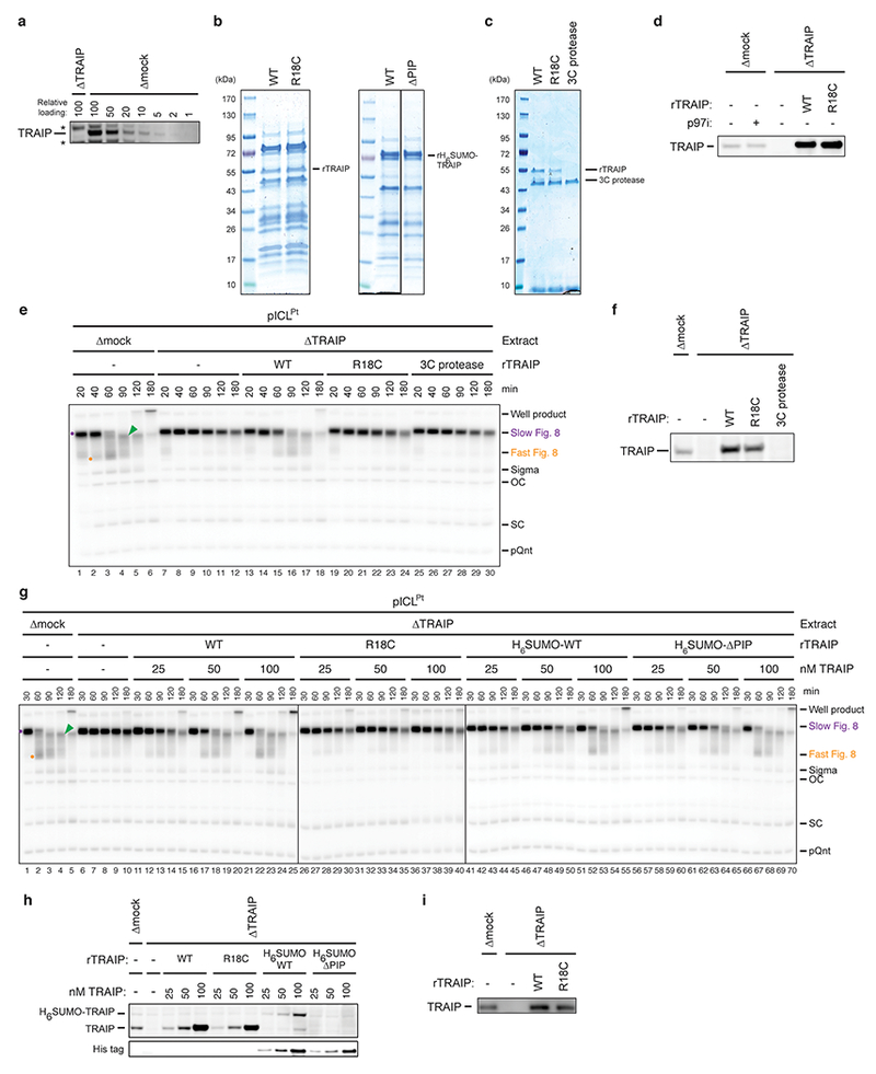 Extended Data Fig. 2 |. Recombinant TRAIP supports CMG unloading at cisplatin-ICLsa, NPE immunodepleted of TRAIP was loaded alongside a dilution series of mock-depleted NPE and blotted for TRAIP. A relative loading amount of 100 corresponds to 2 µl of NPE. Non-specifically detected proteins are marked with asterisks.b, Bacterially-expressed rTRAIPWT, rTRAIPR18C, His6-SUMO-rTRAIPWT, and His6-SUMO-rTRAIPÎPIP (comprising residues 1-455) were partially purified, resolved by SDS-PAGE, and visualized with Coomassie Brilliant Blue staining. Note that His6-SUMO-rTRAIP is obscured by co-migrating, contaminating proteins. Bacterially-expressed rTRAIP was used for all subsequent experiments, unless otherwise indicated.c, rTRAIPWT and rTRAIPR18C were expressed in Sf9 insect cells and purified using an N-terminal 3ÃFLAG tag. The tag was then cleaved using 3C protease. The recombinant proteins, along with a buffer sample containing 3C protease only, were resolved by SDS-PAGE and visualized with Coomassie Brilliant Blue staining.d, Mock- and TRAIP-depleted extracts supplemented with rTRAIPWT or rTRAIPR18C used in Fig. 1b were analyzed by immunoblotting for TRAIP. The absence of the non-specific bands seen in a may be due to shorter incubation with the TRAIP antibody. The concentration of added recombinant TRAIP relative to endogenous TRAIP fluctuates among experiments (e.g. compare panel d and Extended Data Fig. 3b). We ascribe this difference to variations in non-specific removal of endogenous TRAIP from extracts during the mock-depletion procedure, and possibly also in the delivery of recombinant TRAIP into extract.e, pICLPt was replicated in mock- or TRAIP-depleted extracts supplemented with [α-32P]dATP and Sf9-expressed rTRAIPWT, rTRAIPR18C, or 3C protease alone and analyzed as in Fig. 1b.f, Extracts used in the replication reaction shown in e were analyzed as in d.g, pICLPt was replicated in the indicated egg extracts with [α-32P]dATP and analyzed as in Fig. 1b.h, Extracts used in the replication reaction shown in g were analyzed as in d. Note that deleting the C-terminal PIP box disrupts the epitope for the TRAIP antibody used for immunoblotting. Therefore, to assess the activity of TRAIPÎPIP in ICL repair relative to TRAIPWT, His6-SUMO-tagged proteins were added back to TRAIP-depleted extract and assayed in g. The relative amounts of His6-SUMO-TRAIPWT and His6-SUMO-TRAIPÎPIP were compared by detecting the histidine tag. By blotting the same extracts for TRAIP, a comparison of the relative concentrations of His6-SUMO-TRAIPÎPIP and endogenous TRAIP was made.i, Mock- and TRAIP-depleted extracts used in the replication reactions shown in Fig. 1c and d were analyzed as in d. |