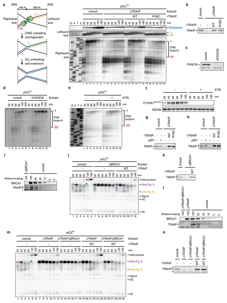 Extended Data Fig. 3 |. TRAIP, but not FANCM, ATR, or BRCA1, is required for CMG unloading at cisplatin-ICLsa, Left, schematic of nascent strands generated at ICLs. When forks converge on an ICL, nascent strands stall ~20 nt from the ICL on either side of the lesion due to the footprint of CMG (green hexamer). AflIII cuts 144 nt to the left and 534 nt to the right of the ICL, generating characteristic products for the leftward and rightward leading strands upon fork convergence, CMG unloading, and leading strand extension. Right, nascent strand analysis of pICLPt replication in the indicated extracts. After replication with [α-32P]dATP, nascent strands were extracted, digested with AflIII, and resolved on a denaturing polyacrylamide gel alongside a sequencing ladder and visualized by autoradiography. As seen previously2,51, when replication forks converged on the ICL in mock-depleted egg extracts, leading strands initially stalled 20-40 nucleotides (nt) from the lesion (lane 1) and then advanced to the â1 position (lanes 2-6), which depends on CMG dissociation19,51. In contrast, in TRAIP-depleted egg extracts, the â20 footprint persisted for three hours (lanes 7-12). This effect was rescued with rTRAIPWT but not rTRAIPR18C (lanes 13-24).b, Extracts used in the replication reaction shown in a were blotted for TRAIP.c, Mock- or FANCM-depleted extracts were blotted for FANCM. A non-specifically detected protein is marked with an asterisk.d, Nascent strand analysis of pICLPt replicating in mock- or FANCM-depleted extracts was performed as in a. The CMG footprint disappeared at the ICL in FANCM-depleted egg extract, consistent with FANCM not being required for CMG unloading at ICLs.e, pICLPt was replicated in the absence or presence of ATR inhibitor ETP-46464 (ATRi), and nascent strand analysis was performed as in a. ATR inhibitor was added to the reaction 2.5 min after initiation. The CMG footprint disappeared at the ICL with or without ATR inhibitor, indicating that ATR signaling is not required for CMG unloading at ICLs.f, Extracts used in e were sampled at various time points and blotted for Xenopus CHK1 Serine-344 phosphorylation to verify ATR inhibition. MCM6 was detected as a loading control.g and h, Mock- and TRAIP-depleted extracts used in one of the replicate reactions quantified in Fig. 1e (g) and f (h) were blotted for TRAIP.i, We previously showed that the immunodepletion of BRCA1 from egg extracts inhibits CMG unloading at ICLs, but this defect could not be rescued with recombinant BRCA1-BARD1 complex6,19. To test whether TRAIP is co-depleted with BRCA1, NPE was immunodepleted of BRCA1 with BRCA1 antiserum, loaded alongside a dilution series of mock-depleted NPE, and blotted for BRCA1 and TRAIP. A relative loading amount of 100 corresponds to 2 µl of NPE. Non-specifically detected proteins are marked with asterisks. This analysis revealed that immunodepletion of BRCA1 also removed TRAIP from NPE. Notably, we also observed TRAIP co-depletion with antibodies against other proteins (data not shown), suggesting it interacts non-specifically with different antibodies.j, The extracts described in i were supplemented with pICLPt, [α-32P]dATP, and rTRAIP, as indicated, and analyzed as in Fig. 1b. rTRAIPWT suppressed the stabilization of the Slow Figure 8 species seen in BRCA1-depleted extract, consistent with the restoration of CMG unloading, and indicating that the unloading defect seen in BRCA1-depleted egg extracts is due primarily to the removal of TRAIP from the extract.k, The extracts used in j were blotted for TRAIP.l, To determine whether BRCA1 contributes to TRAIP-dependent CMG unloading, NPE was immunodepleted of TRAIP or TRAIP and BRCA1 using Protein A Sepharose-purified antibodies purified from antiserum. A dilution series of mock-depleted NPE was loaded alongside the depleted extracts, and extracts were blotted for BRCA1 and TRAIP. A relative loading amount of 100 corresponds to 2 µl of NPE.m, The extracts described in l were supplemented with pICLPt, [α-32P]dATP, and rTRAIP, as indicated, and analyzed as in Fig. 1b. rTRAIPWT suppressed the accumulation of Slow Figure 8s to a similar extent in TRAIP-depleted egg extracts whether or not BRCA1 was co-depleted (lanes 19-30), indicating that BRCA1 is not needed to support TRAIP function. BRCA1 depletion reproducibly resulted in a decrease in well product formation, suggesting a role for BRCA1 in recombination after a double-strand break is formed by ICL unhooking incisions.n, The extracts used in m were blotted for TRAIP. |