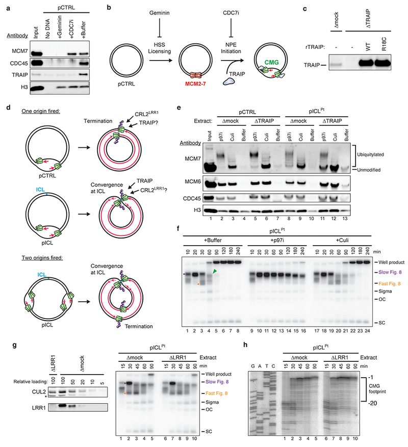Extended Data Fig. 4 |. TRAIP and CRL2LRR1 promote distinct CMG unloading pathwaysa, pCTRL was replicated in NPE in the presence of Geminin or the CDC7 inhibitor PHA-767491 (CDC7i). Eight minutes after addition of NPE, the plasmid was recovered and the indicated proteins were analyzed by immunoblot.b, Cartoon depicting the effects of Geminin and CDC7i, and the step at which TRAIP is recruited to chromatin.c, Extracts used in the replication reaction shown in Fig. 2e were blotted for TRAIP.d, Top, upon termination of pCTRL replication, CMG (green) unloading depends on CRL2LRR1-mediated MCM7 ubiquitylation (purple)21,52, but itâs unknown whether unloading also requires TRAIP. Middle, CMGs that have converged at an ICL undergo TRAIP-dependent ubiquitylation (Fig. 1), but the involvement of CRL2LRR1 is unknown. Bottom, if two origins fire on a single plasmid, one pair of replication forks converges at the ICL and undergoes TRAIP-dependent CMG unloading whereas a second pair undergoes CRL2LRR1-dependent unloading. Because both pairs of CMGs should undergo ubiquitylation, in some experiments we include Culi to monitor only TRAIP-dependent ubiquitylation.e, To determine whether TRAIP is required for CMG unloading during replication termination, we analyzed proteins associated with plasmids 60 min after replication initiation in mock- or TRAIP-depleted extracts containing p97i or Culi, as indicated. Chromatin was recovered and blotted for the indicated proteins. CMG unloading from pCTRL was unaffected by TRAIP depletion (compare lanes 4 and 7). Consistent with this, in the presence of p97i, TRAIP was not required for MCM7 ubiquitylation on pCTRL (compare lanes 2 and 5). In contrast, in the absence of TRAIP, CMG unloading from pICLPt was inhibited compared to the mock-depleted control (compare lanes 10 and 13), consistent with Fig. 1c. Similarly, TRAIP was essential for efficient MCM7 ubiquitylation on pICLPt (compare lanes 8 and 11, note the greater level of unmodified MCM7 in lane 11). The partial CMG unloading (lane 13) and residual MCM7 ubiquitylation observed on pICLPt in the absence of TRAIP (lane 11) were likely the result of termination events that occurred elsewhere on the plasmid (as described in d, bottom). Consistent with this interpretation, the combination of TRAIP depletion and Culi abolished MCM7 ubiquitylation (lane 12).f, To determine whether CRL2LRR1 contributes to CMG unloading at ICLs, pICLPt was replicated in undepleted extract containing p97i or Culi and analyzed as in Fig. 1b. Culi had no significant effect on the accumulation of Fast Figure 8 structures, consistent with CRL2LRR1 being dispensable for CMG unloading at ICLs.g, Left, to assess the effect of LRR1 depletion on CMG unloading at ICLs, NPE was immunodepleted of LRR1, loaded alongside a dilution series of mock-depleted NPE, and blotted for LRR1 and CUL2. A relative loading amount of 100 corresponds to 2 µl of NPE. Non-specifically detected protein is marked with an asterisk. Right, pICLPt was replicated in mock- or LRR1-depleted egg extracts and analyzed as in Fig. 1b. The absence of LRR1 had no effect on the formation of Fast Figure 8 structures, supporting the idea that CRL2LRR1 is dispensable for CMG unloading at ICLs.h, Nascent strand analysis of pICLPt replicating in mock- or LRR1-depleted extracts was performed as in Extended Data Fig. 3a. The CMG footprint disappeared with normal kinetics at the ICL in LRR1-depleted egg extract, consistent with CRL2LRR1 not being required for CMG unloading at ICLs. |
