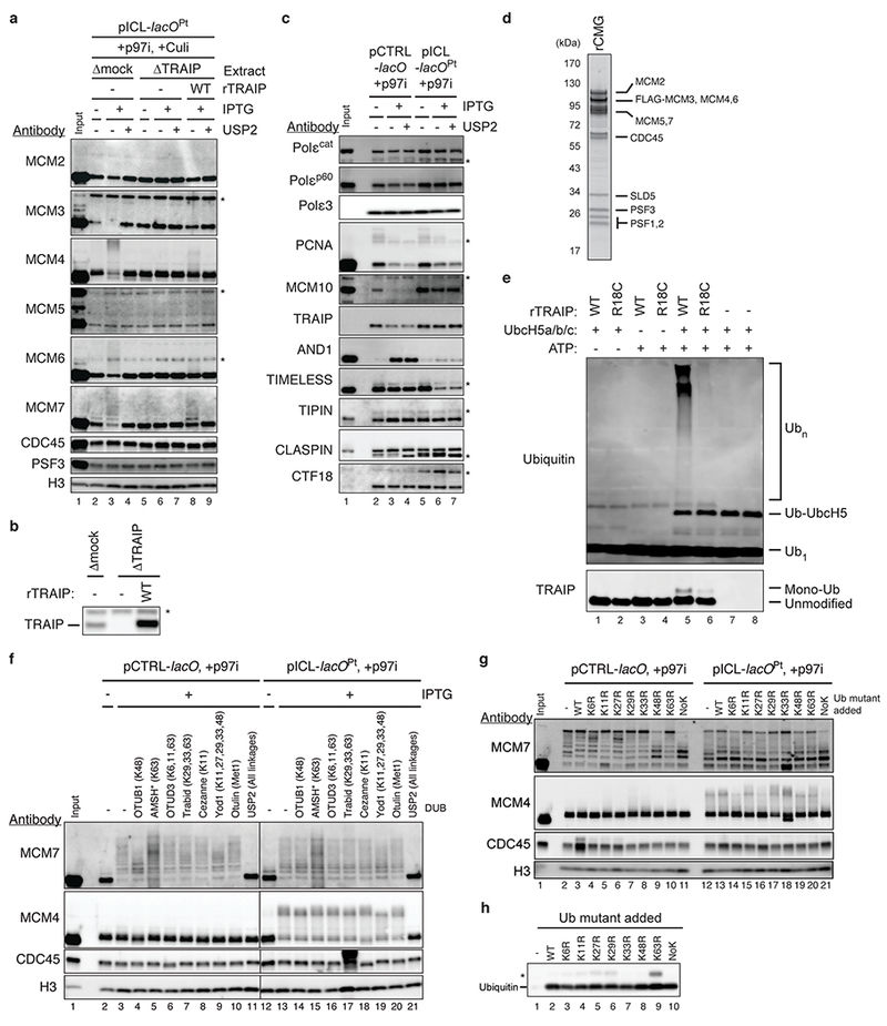 Extended Data Fig. 5 |. TRAIP ubiquitylates numerous CMG subunits with heterotypically-linked chains upon fork convergence at an ICLa, pICL-lacOPt was incubated with LacR prior to replication in mock- or TRAIP-depleted extracts. After 1 hr of replication (to allow for termination of replication forks that do not converge on the ICL or lacO array as depicted in Fig. 2c), 0.3 mM NMS-873 was added and the extracts were incubated for 5 min to inhibit p97. 10 mM IPTG and Sf9-expressed rTRAIPWT were then added as indicated and the extract was incubated for 2 hr to disrupt LacR DNA binding and allow fork convergence and TRAIP-dependent ubiquitylation. The plasmid was recovered and blotted for the indicated proteins.b, The extracts described in a were blotted for TRAIP.c, pICL-lacOPt was incubated with LacR prior to replication in undepleted egg extracts. After 30 min of replication (to allow for termination of replication forks that do not converge on the ICL or lacO array as depicted in Fig. 2c), 0.3 mM NMS-873 was added and the extracts were incubated for 5 min to inhibit p97. 10 mM IPTG was then added as indicated to disrupt LacR DNA binding and the extract was incubated for 1 hr to allow fork convergence. The plasmid was recovered and blotted for the indicated proteins.d, Recombinant CMG was purified, resolved by SDS-PAGE, and visualized with SYPRO ruby staining.e, rTRAIP ubiquitin ligase activity. rTRAIPWT or rTRAIPR18C was combined with ubiquitin, E1, three E2s (UbcH5a/b/c), and ATP as indicated. Polyubiquitin chain synthesis (top gel) and TRAIP autoubiquitylation (bottom gel) were detected by immunoblotting the reactions with ubiquitin and TRAIP antibody, respectively. Notably, rTRAIPR18C was much more compromised in forming free polyubiquitin chains in this assay than it was in ubiquitylating rCMG (see Fig. 2d). The data suggest that the interaction between TRAIP and CMG can suppress, to a great extent, the profound ubiquitylation defect of the R18C mutation.f, pCTRL-lacO and pICL-lacOPt were replicated in undepleted extract as in c and recovered. Samples were treated with the indicated DUBs and blotted for the indicated proteins.g, pCTRL-lacO and pICL-lacOPt pre-bound with LacR were replicated in undepleted extract as in c. At the time of IPTG addition to release the LacR array and allow fork convergence, 100 µM recombinant ubiquitin (wild-type or various lysine-to-arginine mutants) was added to the extract (which contains ~8 µM endogenous ubiquitin) and incubated for 1 hr. The plasmid was recovered and blotted for the indicated proteins.h, Extracts used in g were blotted for ubiquitin. Some ubiquitin mutants contain a di-ubiquitin species (marked with asterisk). Whether this arises upon addition to extract is unclear. |