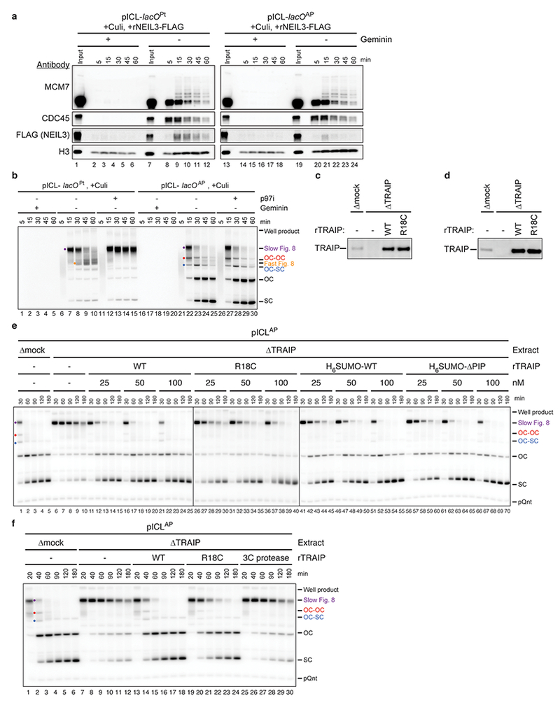 Extended Data Fig. 6 |. AP-ICL repair by NEIL3 requires TRAIPa, Analysis of chromatin-associated proteins during replication of pICL-lacOPt or pICL-lacOAP in undepleted extract in the presence and absence of Geminin, as indicated. At different times after replication initiation, chromatin was recovered and blotted for the indicated proteins.b, pICL-lacOPt and pICL-lacOAP were replicated in undepleted extract supplemented with Culi, Geminin, and p97i, as indicated, and analyzed as in Fig. 1b.c, The extracts used in the replication reaction shown in Fig. 3a were blotted for TRAIP.d, Extracts used in one of the reactions quantified in Fig. 3b were analyzed as in c.e and f, pICLAP was replicated in the extracts shown in Extended Data Fig. 2h (e) and Extended Data Fig. 2f (f) with [α-32P]dATP and analyzed as in Fig. 1b. |