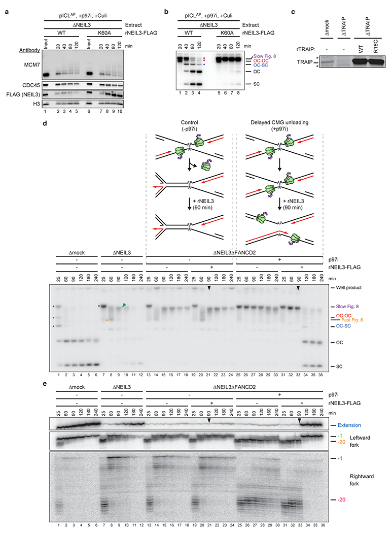 Extended Data Fig. 7 |. ICL repair by NEIL3 requires CMG association with chromatina, Analysis of proteins associated with pICLAP during replication with NEIL3-depleted extract supplemented with rNEIL3WT or catalytically inactive rNEIL3K60A, p97i, and Culi. At the indicated times after replication initiation, chromatin was recovered and blotted for the indicated proteins. Consistent with NEIL3 dissociating rapidly after unhooking, rNEIL3K60A was recovered more efficiently with pICLAP than rNEIL3WT.b, pICLAP was replicated with NEIL3-depleted extract supplemented with rNEIL3WT or rNEIL3K60A, p97i, and Culi, as indicated, and analyzed as in Fig. 1b.c, The extracts used in Fig. 3c were blotted for TRAIP. Non-specifically detected proteins are marked with asterisks.d, If NEIL3 activity is coupled to ubiquitylated CMG, NEIL3 should only function before CMG has been unloaded. To test this prediction, we inhibited all unhooking events by depleting egg extracts of NEIL3 (to block the NEIL3 pathway) and FANCD2 (to block the FA pathway). At a late time point (90 min), we added back rNEIL3 to extract where CMG had been allowed to unload (-p97i), or extract where CMG unloading was prevented (+p97i). Our model predicts that rNEIL3 should unhook the ICL only in the latter setting. Top, schematic illustrating late addition of rNEIL3 to NEIL3- and FANCD2-depleted egg extracts in the absence (left) or presence (right) of p97i. Bottom, replication of pICLAP in mock-, NEIL3-, or NEIL3- and FANCD2-depleted extracts in the presence of [α-32P]dATP. Extracts were supplemented with p97i as indicated and rNEIL3 was added at 90 min where indicated (black arrowheads). Replication intermediates were resolved and visualized as in Fig. 1b. Depletion of NEIL3 and FANCD2 blocked all unhooking of the AP-ICL, resulting in an accumulation of reversed forks (lane 9, green arrowhead). Addition of rNEIL3 at 90 min. in the absence of p97i (after CMG unloading) failed to induce unhooking, based on the persistence of the reversed forks (lanes 21-24). In contrast, when CMG unloading was prevented with p97i (lanes 25-30; note the persistence of Slow Figure 8 intermediates), late rNEIL3 addition led to efficient ICL unhooking, as seen from the rapid conversion of Slow Figure 8s to open circular and supercoiled species (lanes 34-36). This gel image was compressed vertically to fit the page.e, To confirm the presence or absence CMG at the AP-ICL, DNA was recovered from the reactions described in d and subjected to nascent strand analysis as in Extended Data Fig. 3a. Top, extension products and nascent strands of the leftward fork. Bottom, nascent strands of the rightward fork. Black arrowheads, rNEIL3 addition. Depletion of NEIL3 and FANCD2 did not affect loss of the CMG footprint at â20 and caused persistence of nascent DNA strands at â1 (lanes 13-24), indicative of failure to unhook the ICL. Late addition of NEIL3 failed to stimulate further nascent strand extension (lanes 21-24), indicating that unhooking did not occur. Treatment with p97i caused persistence of the CMG footprint at â20 (lanes 25-30), consistent with retention of CMG at the ICL, and late addition of NEIL3 stimulated formation of full-length nascent strand extension products (lanes 34-36), indicative of efficient unhooking. Taken together, the data in d and e strongly suggest that NEIL3 activity is coupled to the presence of CMG at the site of the ICL, although we cannot rule out that NEIL3 activity is suppressed by downstream events, such as fork reversal, that depend on CMG unloading. |