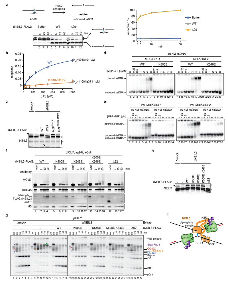 Extended Data Fig. 8 |. The zinc-finger domains of NEIL3 contribute to its recruitment to the replication forka, Left, to determine whether rNEIL3Î291 is catalytically active, a model AP-ICL substrate comprising a synthetic 5â²-radiolabeled 24mer oligonucleotide cross-linked to a ~3mer was mixed with rNEIL3Î291 or rNEIL3WT. Cross-linked and unhooked species were resolved by denaturing polyacrylamide gel electrophoresis and visualized by autoradiography. Asterisks indicate the 32P radiolabel. Note that the cross-linked species migrates as a doublet due to heterogeneity in the bottom strand following RNase digestion (see Methods for details). Right, quantification of unhooking. Equivalent results were obtained in three independent experiments, which show that rNEIL3Î291 retains full glycosylase activity.b, Interaction of the NEIL3 NPL4-type zinc finger (NZF; residues 300 to 328) with ubiquitin. GST-NEIL3 NZF fusion protein (WT or TL,LV substituted) was immobilized on a biosensor tip and monoubiquitin binding was measured by biolayer interferometry (BLI). The ubiquitin binding response was corrected for non-specific binding to GST and plotted as a function of ubiquitin concentration. Error bars represent standard error of the mean from three independent experiments.c, Extracts used in Fig. 3e were blotted for NEIL3. Black arrowheads, NEIL3-specific bands. rNEIL3Î291 is not efficiently detected by the NEIL3-specific primary antibody. Non-specifically detected proteins are marked with asterisks.d and e, To test whether the two GRF zinc fingers in NEIL3 interact with ssDNA, we expressed each individually and performed electrophoretic mobility shift assays. rMBP-NEIL3 GRF zinc finger fusion proteins (wild-type or substituted) were incubated with 5â²-radiolabeled 25-mer ssDNA or dsDNA. Bound and unbound DNAs were resolved by native polyacrylamide gel electrophoresis and visualized by autoradiography. This analysis reveals that both GRF domains bind specifically to ssDNA.f, Analysis of proteins associated with pICLPt during replication in undepleted extract in the presence of p97i and Culi. Extracts were supplemented with wild-type or mutated rNEIL3. At different times, chromatin was recovered and blotted for the indicated proteins. The individual GRF substitutions modestly affected recovery of rNEIL3 upon pICL pull-down while combination of the substitutions or deletion of both GRF zinc fingers strongly reduced rNEIL3 recovery, indicating that interactions mediated by the GRF zinc fingers promote recruitment of NEIL3 to an ICL.g, pICLAP was replicated in mock- or NEIL3-depleted extracts supplemented with wild-type or mutated NEIL3 as indicated and analyzed as in Fig. 1b. Relative to rNEIL3WT, rNEIL3 with substitutions in either GRF zinc finger that abolish ssDNA binding (K500E and K546E) exhibited modest defects in pICLAP unhooking that were exacerbated when the substitutions were combined, indicating that interactions between the GRF zinc fingers and ssDNA contribute to ICL repair.h, Extracts used in the replication reactions shown in g, were blotted for NEIL3. Non-specifically detected proteins are marked with asterisks.i, Model for recruitment of NEIL3 to chromatin by zinc finger-mediated interactions. Upon replication fork convergence at an ICL, TRAIP-dependent CMG ubiquitylation recruits NEIL3 through direct interactions between NEIL3âs NZF domain and ubiquitin. Association of NEIL3 with chromatin is further enhanced by interactions between the tandem GRF zinc fingers and single stranded DNA, possibly on the lagging strand template. |
