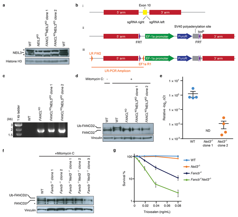 Extended Data Fig. 9 |. Knockout of the FA and NEIL3 pathways have additive effects on ICL sensitivity in mammalian cellsa, Immunoblot analysis of NEIL3 expression in wild-type, NEIL3, and FANCL/NEIL3 knockout HAP1 cell lines. Histone H3 was detected as a loading control. Non-specifically detected proteins are marked with asterisks.b, Schematic of FANCL CRISPR targeting. (i) Human FANCL exon 10, sgRNA binding sites, and homology arm targets, (ii) FANCL-Puro targeting construct with homology arms flanking exon 10, (iii) Targeted FANCL allele with integrated puromycin resistance cassette.c, Detection of the integrated puromycin resistance cassette in HAP1 cells by FANCL long-range PCR.d, Analysis of FANCD2 ubiquitylation in MMC-treated wild-type, FANCL, and FANCL/NEIL3 knockout HAP1 cell lines to confirm FANCL knockout. Vinculin was detected as a loading control. FANCL is the catalytic subunit of the FA core complex, which ubiquitylates FANCD2.e, Neil3 qRT-PCR confirming gene disruption in CH12 cell lines. ND, not detected.f, Analysis of FANCD2 ubiquitylation in mitomycin C-treated CH12 Fancb single and Neil3/Fancb double knockout cell lines to confirm Fancb knockout. Vinculin was detected as a loading control. A non-specifically detected protein is marked with an asterisk.g, Cell viability of wild-type, Fancb, Neil3, or Fancb/Neil3 knockout CH12 cells after exposure to trioxsalen and UV-A irradiation. Two independent clones were used for the single mutants and three independent clones were used for the double mutant. Error bars, standard error of the mean. We speculate that, relative to HAP1 cells, CH12 cells may be more reliant on the FA pathway to repair trioxsalen-induced damage due to lower expression levels of NEIL3. |